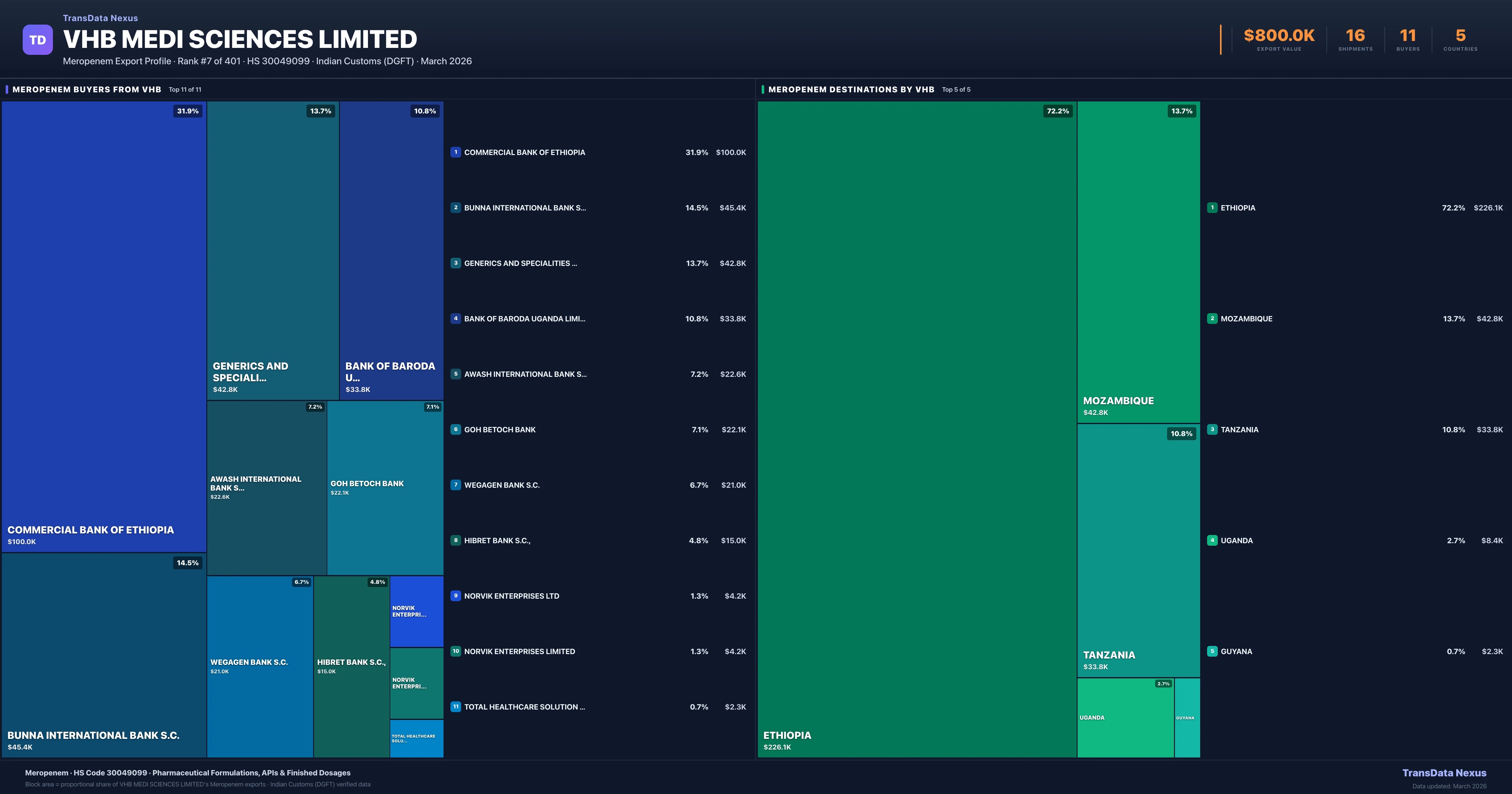 VHB Medi Sciences Limited supplies Meropenem to 11 buyers globally. The largest buyer is COMMERCIAL BANK OF ETHIOPIA (ETHIOPIA), followed by BUNNA INTERNATIONAL BANK S.C. (ETHIOPIA) and GENERICS AND SPECIALITIES LTD (MOZAMBIQUE). These buyers represent pharmaceutical distributors, hospital groups, and government procurement agencies in their respective markets.