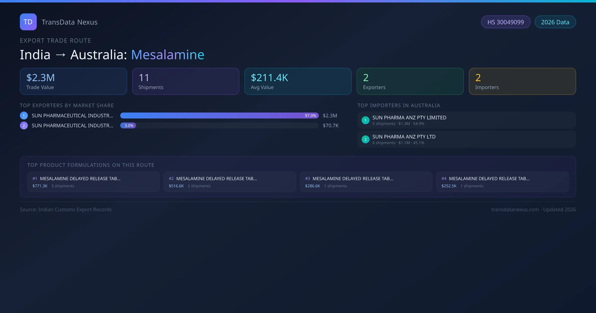 India has recorded 11 verified shipments of Mesalamine exported to Australia, representing a combined trade value of $2.3M USD. This corridor is served by 2 active Indian exporters, with an average shipment value of $211.4K USD. The leading Indian exporter is SUN PHARMACEUTICAL INDUSTRIES LIMITED, which accounts for 97% of total export value with 10 shipments worth $2.3M USD. On the buying side, SUN PHARMA ANZ PTY LIMITED is the largest importer in Australia with $1.3M USD in purchases. All data sourced from Indian Customs (DGFT) shipping bill records. Values reported in FOB USD.