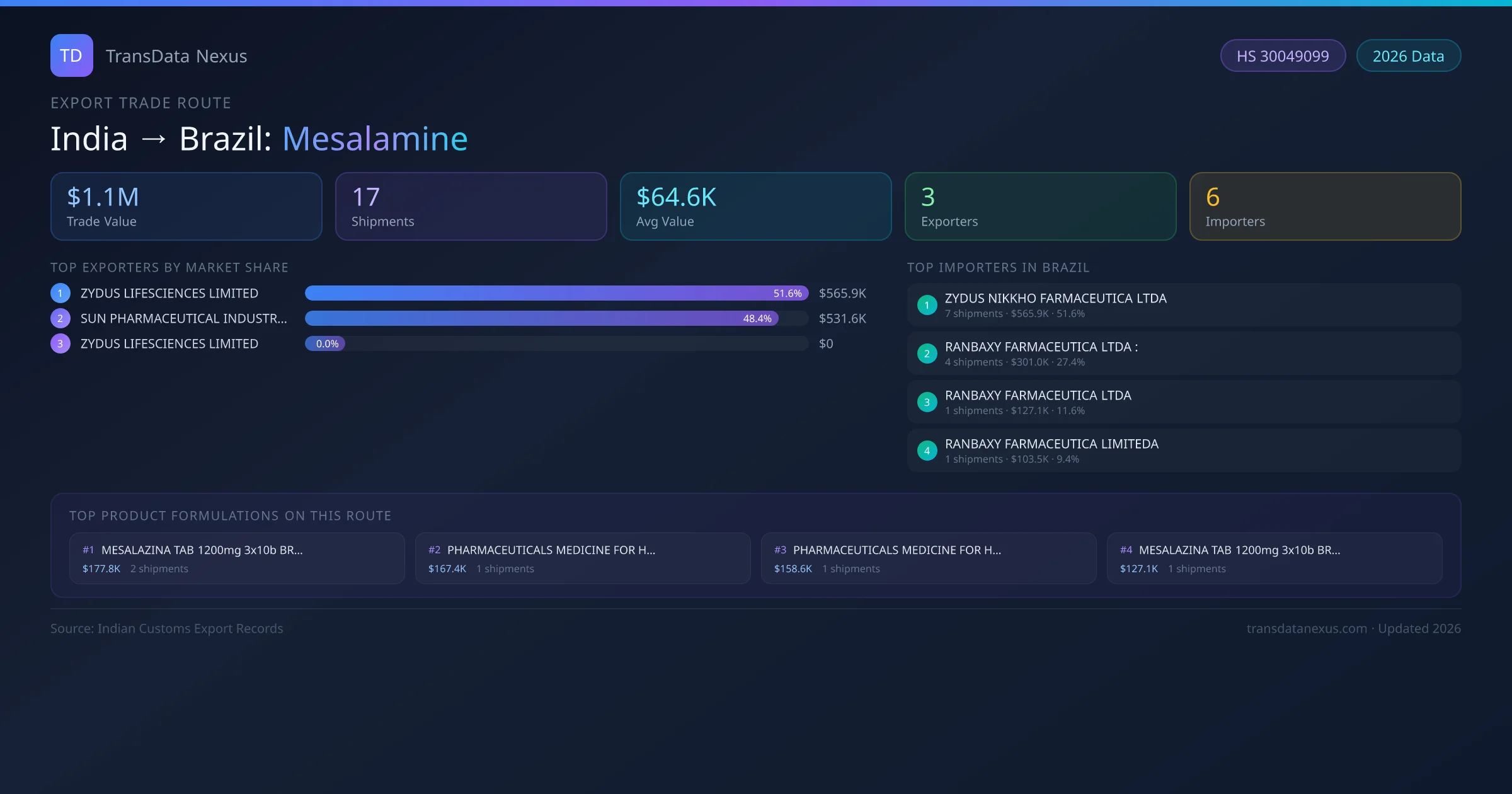 The India to Brazil Mesalamine corridor is one of India's established pharmaceutical export routes, with 17 shipments documented worth a combined $1.1M USD. The route is dominated by ZYDUS LIFESCIENCES LIMITED, which alone accounts for roughly 52% of all export value, reflecting the consolidated nature of India's mesalamine manufacturing sector.