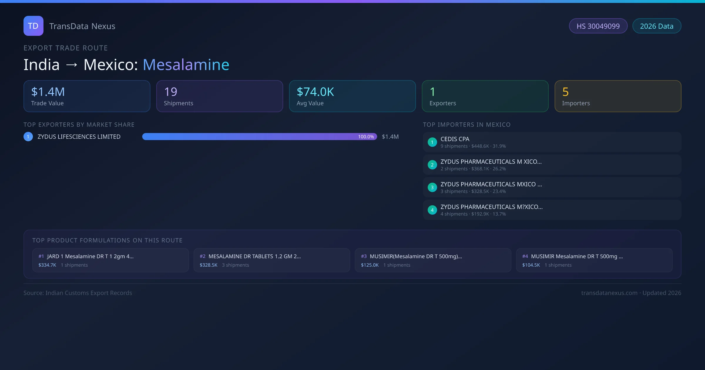 The India to Mexico Mesalamine corridor is one of India's established pharmaceutical export routes, with 19 shipments documented worth a combined $1.4M USD. The route is dominated by ZYDUS LIFESCIENCES LIMITED, which alone accounts for roughly 100% of all export value, reflecting the consolidated nature of India's mesalamine manufacturing sector.