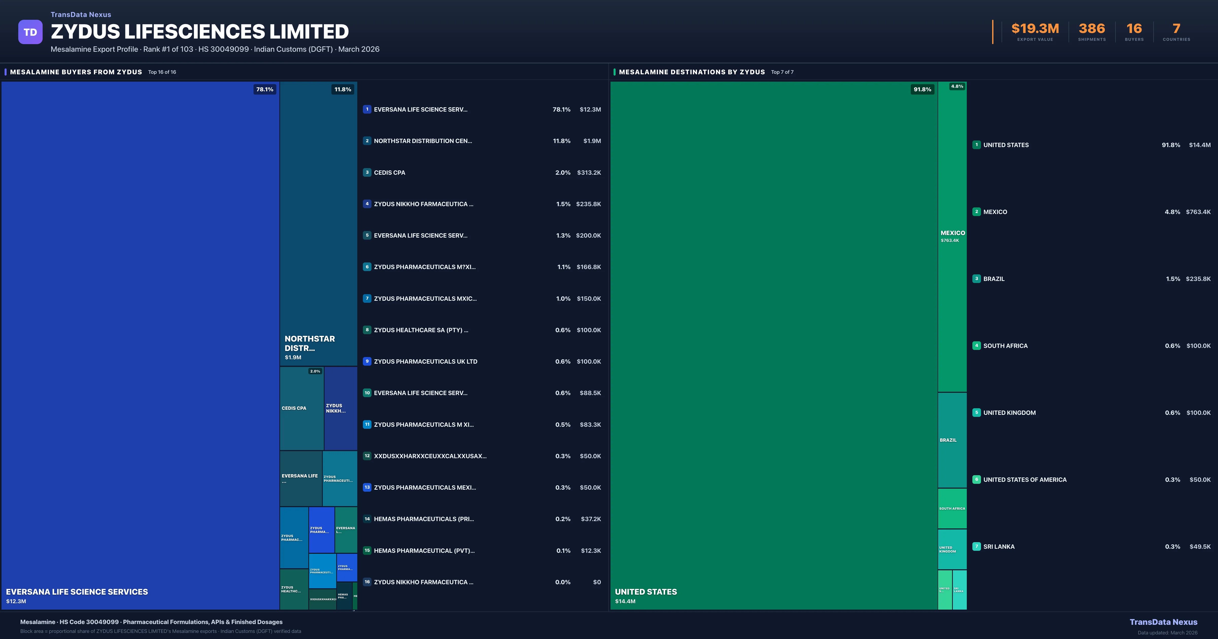 Access shipment-level details, pricing data, buyer connections, and competitive analysis for Zydus Lifesciences Limited's Mesalamine exports. TransData Nexus provides verified Indian Customs (DGFT) data trusted by pharmaceutical trade professionals worldwide.