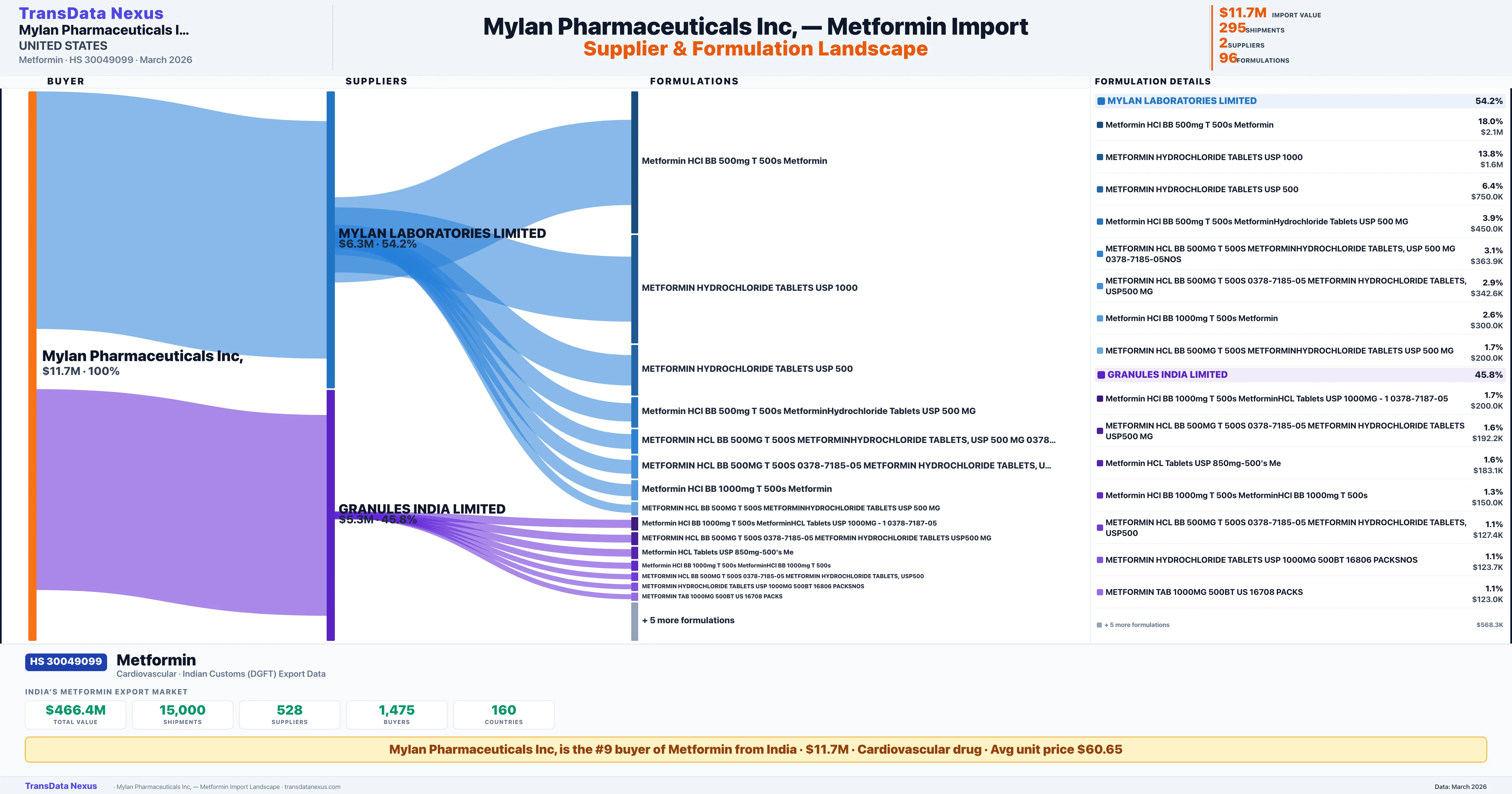 MYLAN PHARMACEUTICALS INC sources Metformin from 2 verified Indian suppliers: MYLAN LABORATORIES LIMITED ($6.3M, 54.2%), GRANULES INDIA LIMITED ($5.3M, 45.8%). This is based on 295 customs records.