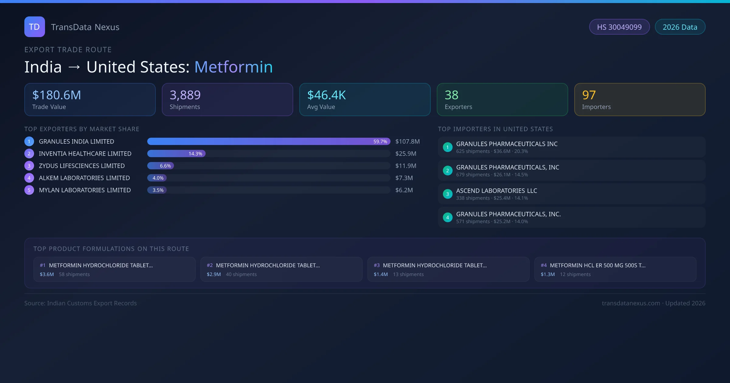 India has recorded 3,889 verified shipments of Metformin exported to United States, representing a combined trade value of $180.6M USD. This corridor is served by 38 active Indian exporters, with an average shipment value of $46.4K USD. The leading Indian exporter is GRANULES INDIA LIMITED, which accounts for 60% of total export value with 2,114 shipments worth $107.8M USD. On the buying side, GRANULES PHARMACEUTICALS INC is the largest importer in United States with $36.6M USD in purchases. The top 3 suppliers — GRANULES INDIA LIMITED, INVENTIA HEALTHCARE LIMITED, ZYDUS LIFESCIENCES LIMITED — together control 81% of total trade value on this route. All data sourced from Indian Customs (DGFT) shipping bill records. Values reported in FOB USD.