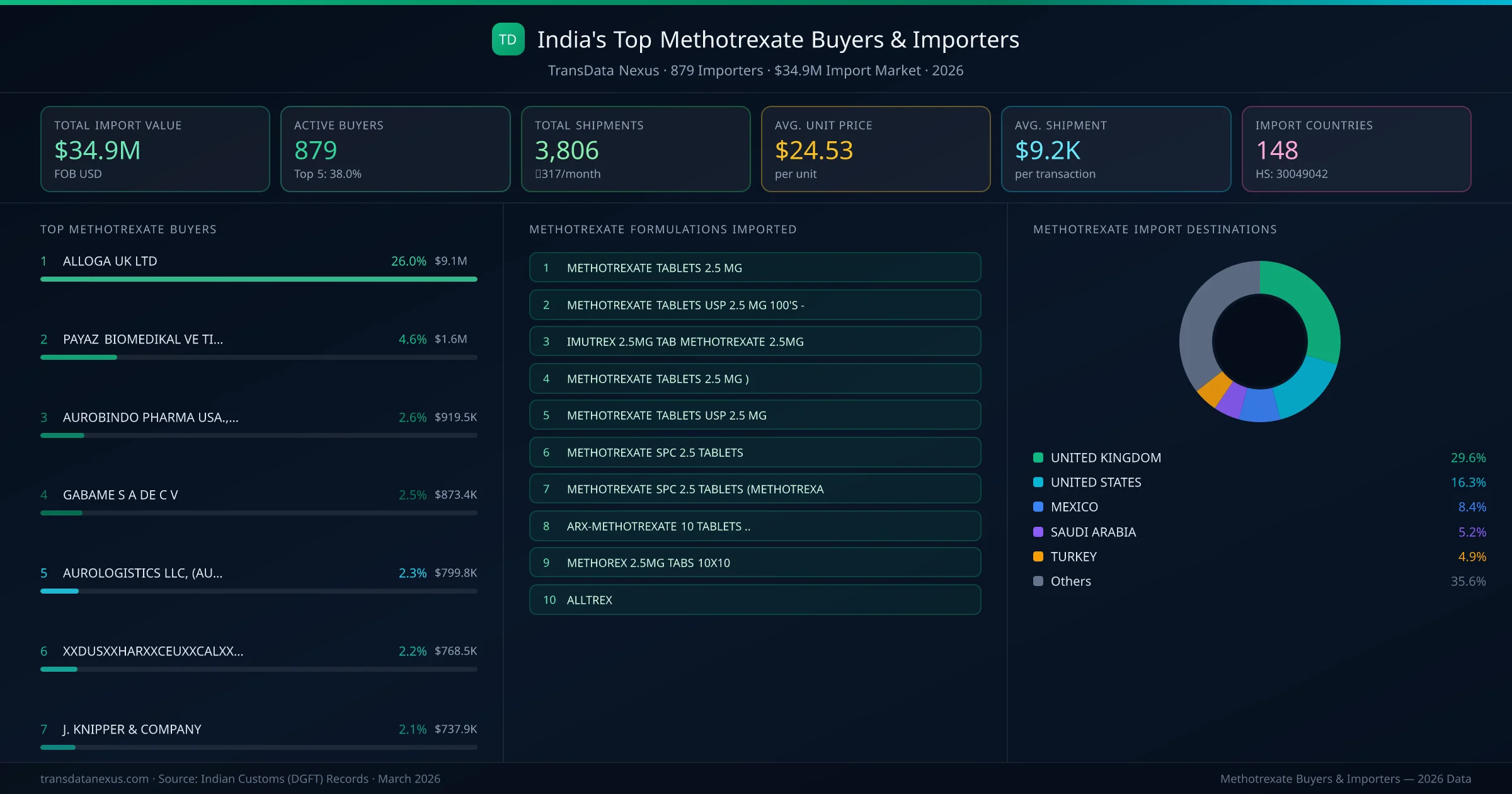 ALLOGA UK LTD (UNITED KINGDOM) is the leading methotrexate importer from India, holding a 26.0% share of the $34.9M market across 3,806 shipments from 879 buyers. The top 5 buyers — ALLOGA UK LTD (UNITED KINGDOM), PAYAZ BIOMEDIKAL VE TIBBI CIHAZLAR (TURKEY), AUROBINDO PHARMA USA., INC, (UNITED STATES), GABAME S A DE C V (MEXICO), AUROLOGISTICS LLC, (AUROBINDO PHARM (UNITED STATES) — collectively control 38.0% of total import value.