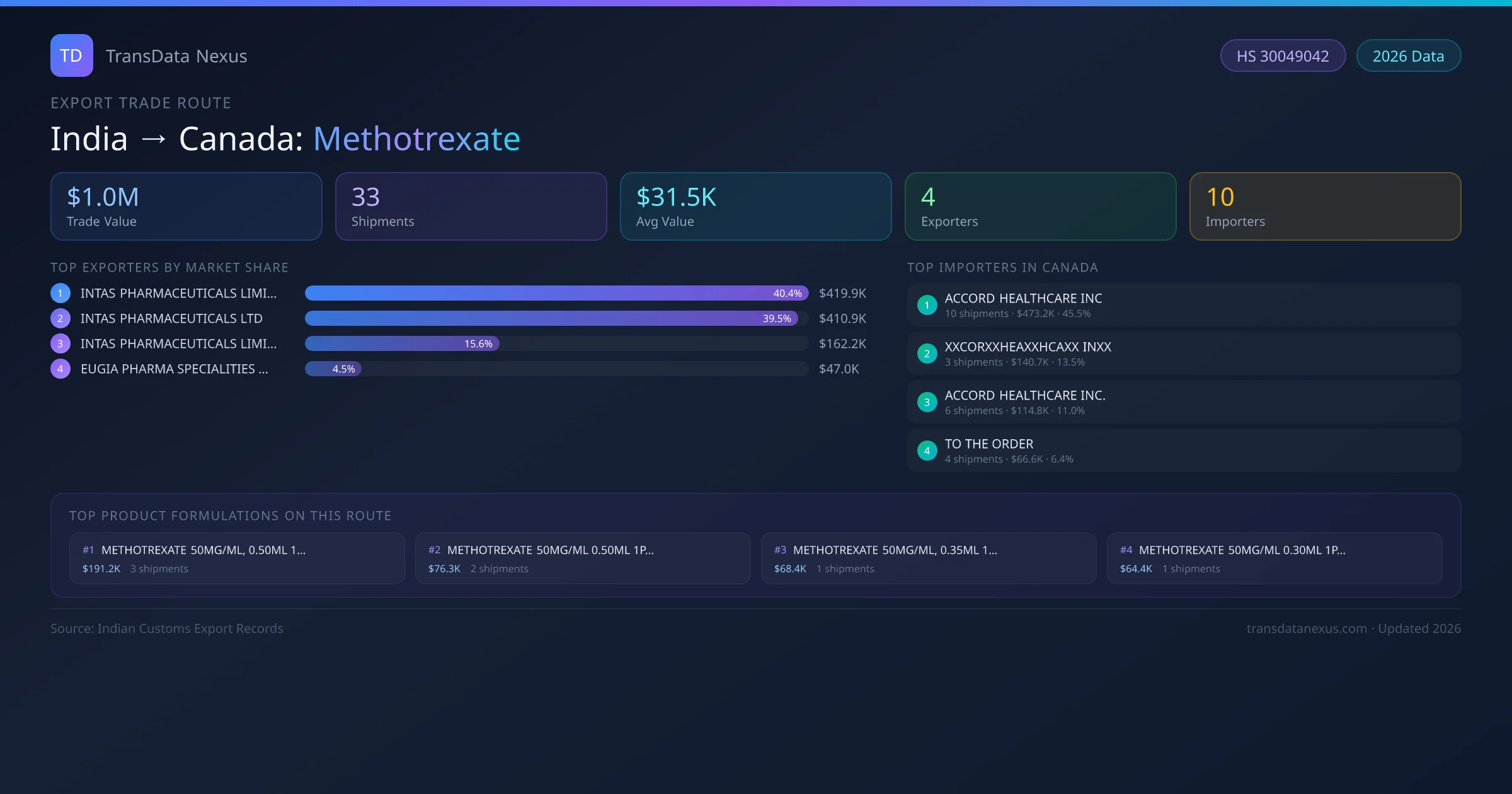 India has recorded 33 verified shipments of Methotrexate exported to Canada, representing a combined trade value of $1.0M USD. This corridor is served by 4 active Indian exporters, with an average shipment value of $31.5K USD. The leading Indian exporter is INTAS PHARMACEUTICALS LIMITED, which accounts for 40% of total export value with 16 shipments worth $419.9K USD. On the buying side, ACCORD HEALTHCARE INC is the largest importer in Canada with $473.2K USD in purchases. The top 3 suppliers — INTAS PHARMACEUTICALS LIMITED, INTAS PHARMACEUTICALS LTD, INTAS PHARMACEUTICALS LIMITED — together control 95% of total trade value on this route. All data sourced from Indian Customs (DGFT) shipping bill records. Values reported in FOB USD.