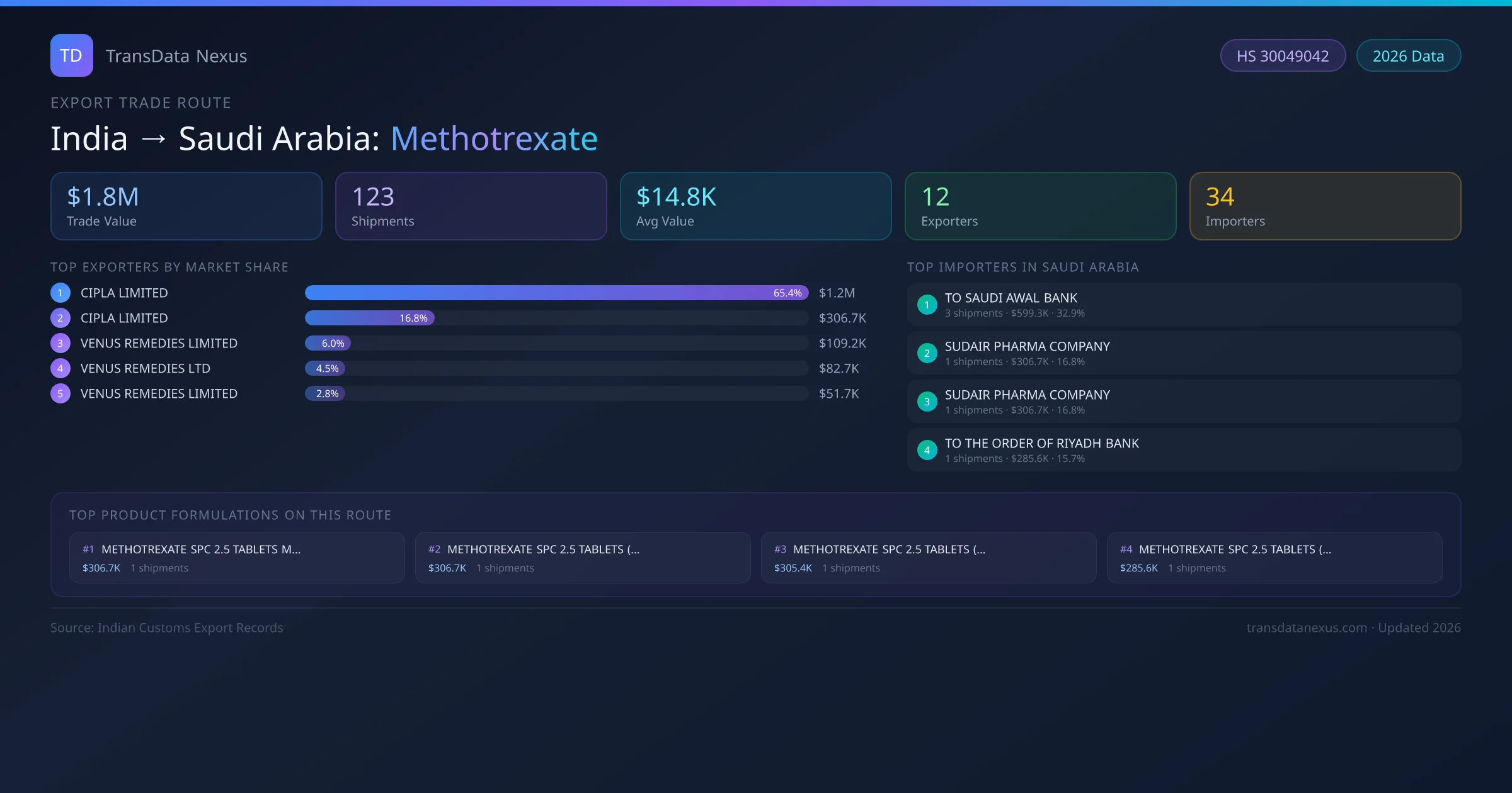 - 1.Route Identification: India to Saudi Arabia export trade corridor identified from Indian Customs (DGFT) records for Methotrexate.