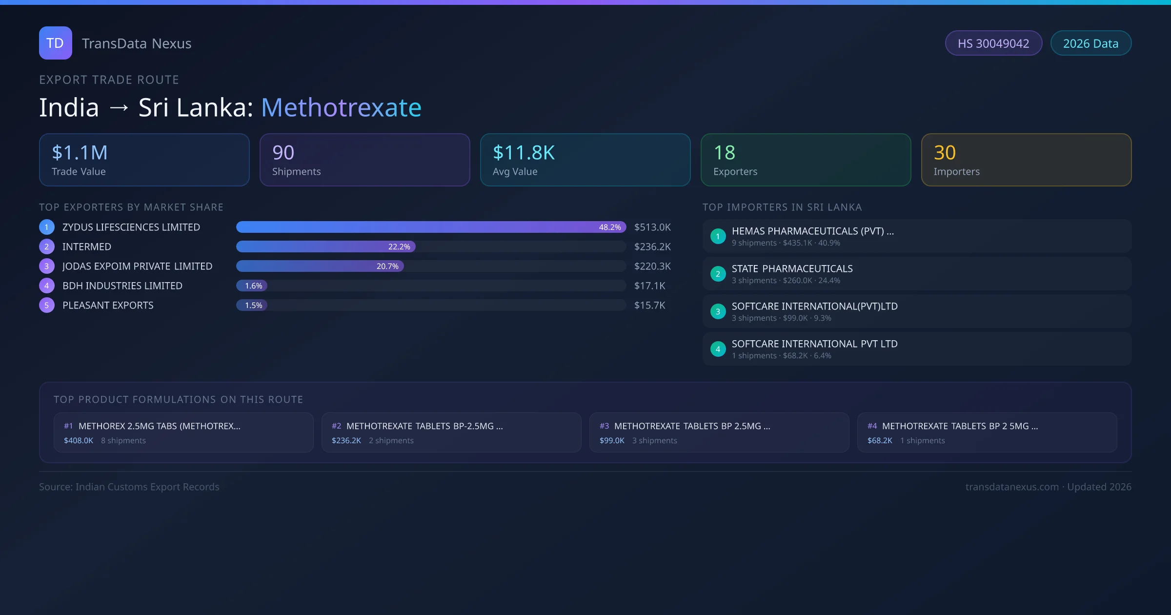 - 1.Route Identification: India to Sri Lanka export trade corridor identified from Indian Customs (DGFT) records for Methotrexate.