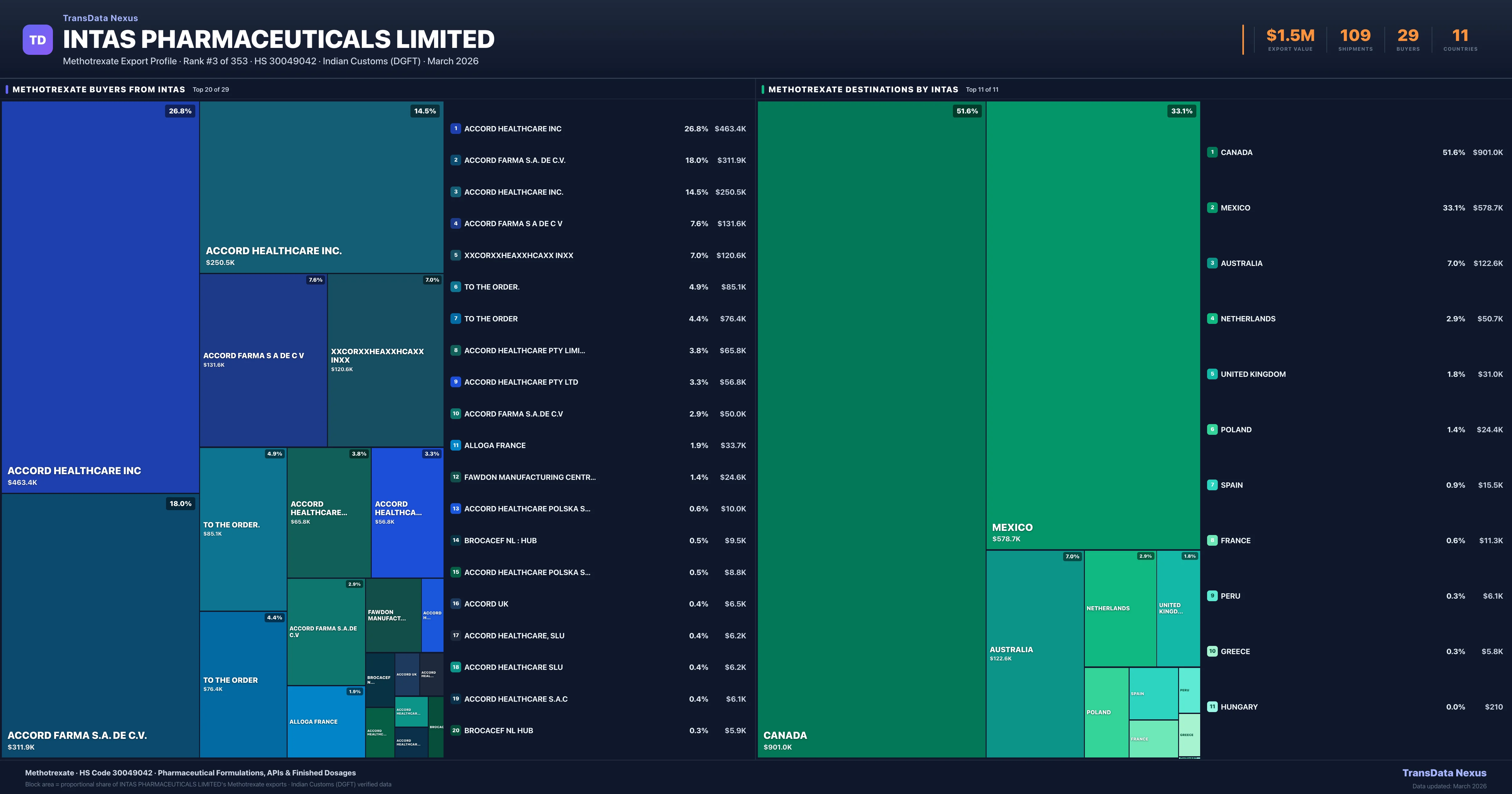Intas Pharmaceuticals Limited supplies Methotrexate to 29 buyers globally. The largest buyer is ACCORD HEALTHCARE INC (CANADA), followed by ACCORD FARMA S.A. DE C.V. (MEXICO) and ACCORD HEALTHCARE INC. (CANADA). These buyers represent pharmaceutical distributors, hospital groups, and government procurement agencies in their respective markets.