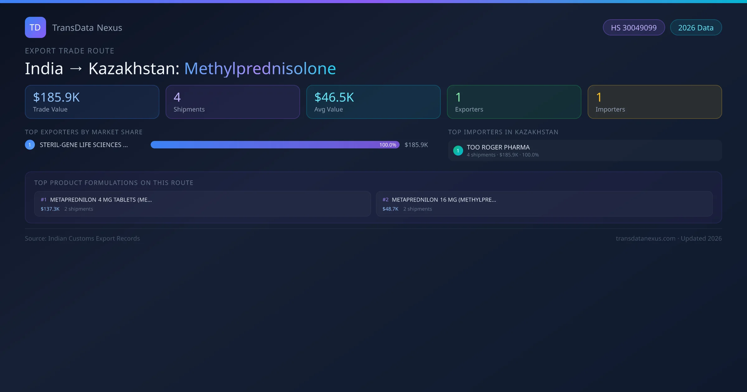 The India to Kazakhstan Methylprednisolone corridor is one of India's established pharmaceutical export routes, with 4 shipments documented worth a combined $185.9K USD. The route is dominated by STERIL-GENE LIFE SCIENCES PRIVATE LIMITED, which alone accounts for roughly 100% of all export value, reflecting the consolidated nature of India's methylprednisolone manufacturing sector.