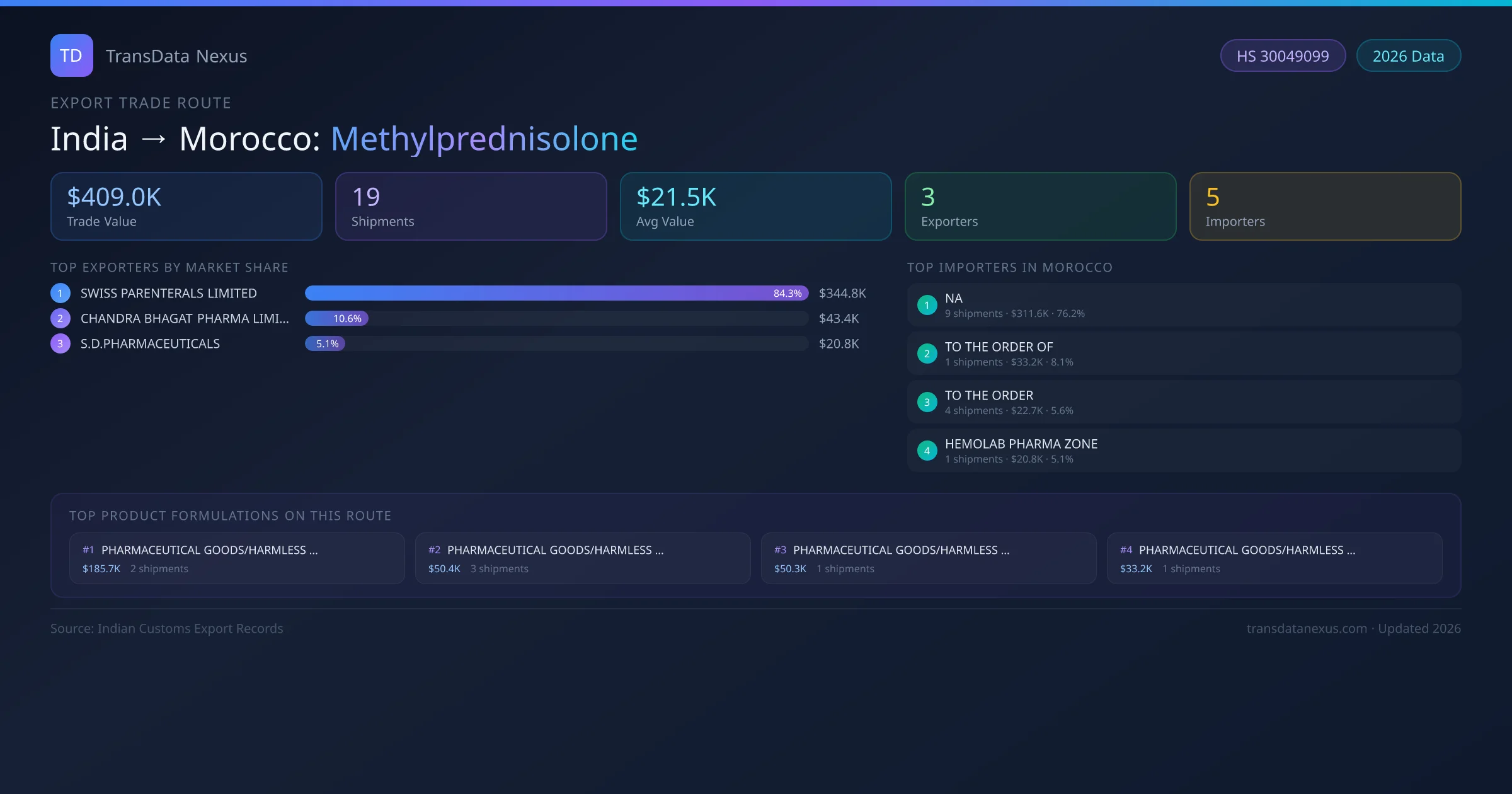 - 1.Route Identification: India to Morocco export trade corridor identified from Indian Customs (DGFT) records for Methylprednisolone.