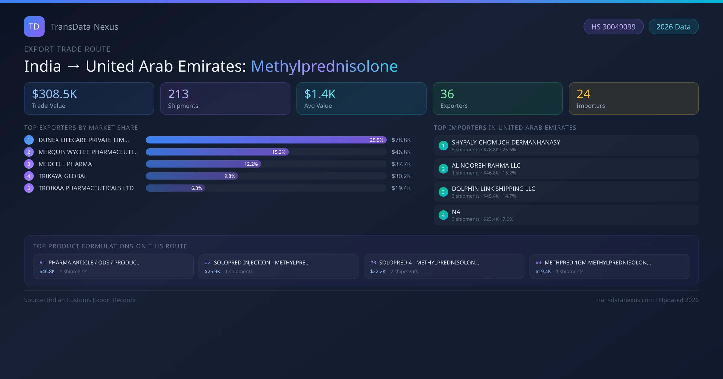 - 1.Route Identification: India to United Arab Emirates export trade corridor identified from Indian Customs (DGFT) records for Methylprednisolone.