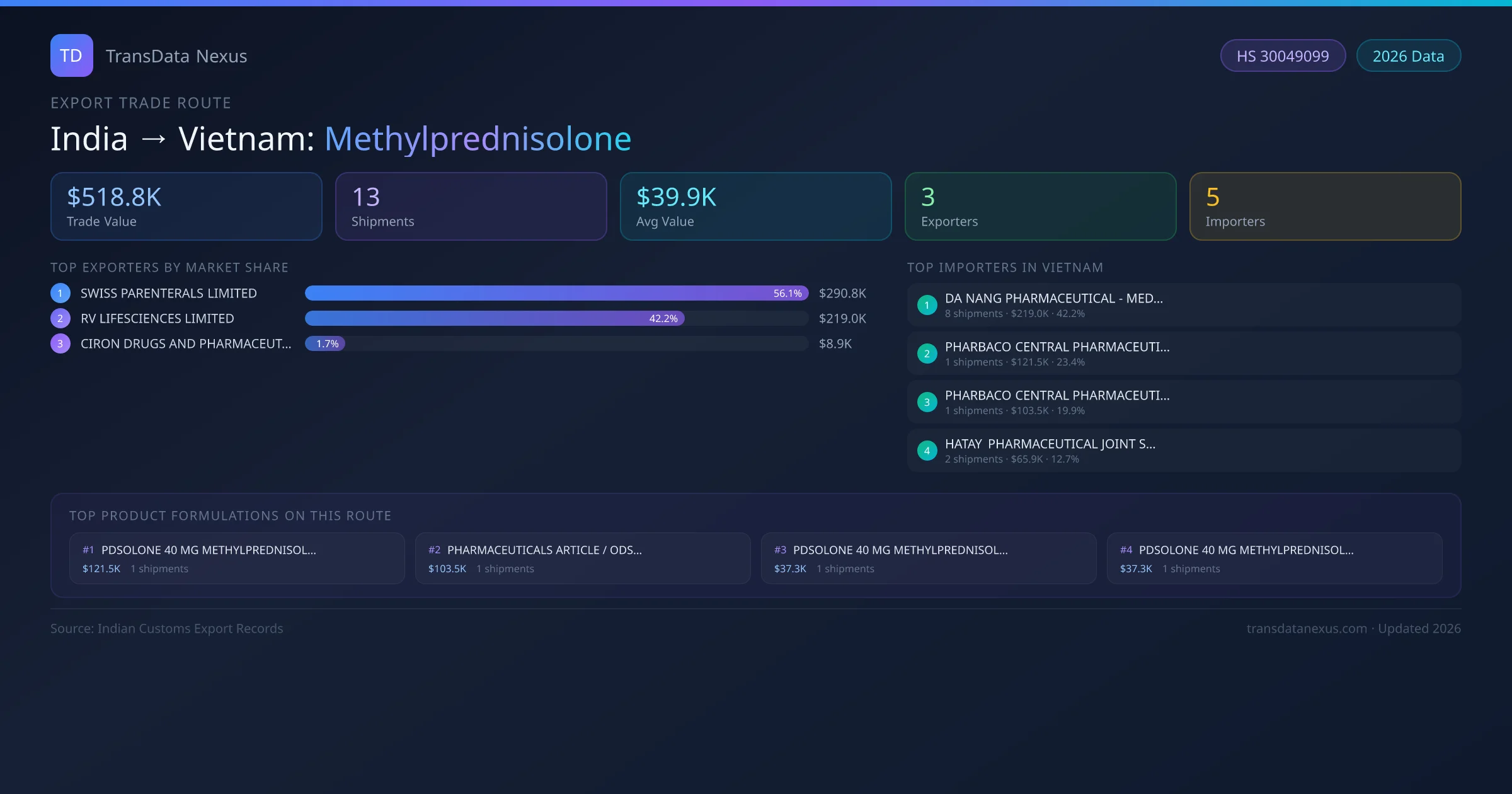 India has recorded 13 verified shipments of Methylprednisolone exported to Vietnam, representing a combined trade value of $518.8K USD. This corridor is served by 3 active Indian exporters, with an average shipment value of $39.9K USD. The leading Indian exporter is SWISS PARENTERALS LIMITED, which accounts for 56% of total export value with 4 shipments worth $290.8K USD. On the buying side, DA NANG PHARMACEUTICAL - MEDICAL EQ is the largest importer in Vietnam with $219.0K USD in purchases. The top 3 suppliers — SWISS PARENTERALS LIMITED, RV LIFESCIENCES LIMITED , CIRON DRUGS AND PHARMACEUTICALS PRIVATE LIMITED — together control 100% of total trade value on this route. All data sourced from Indian Customs (DGFT) shipping bill records. Values reported in FOB USD.