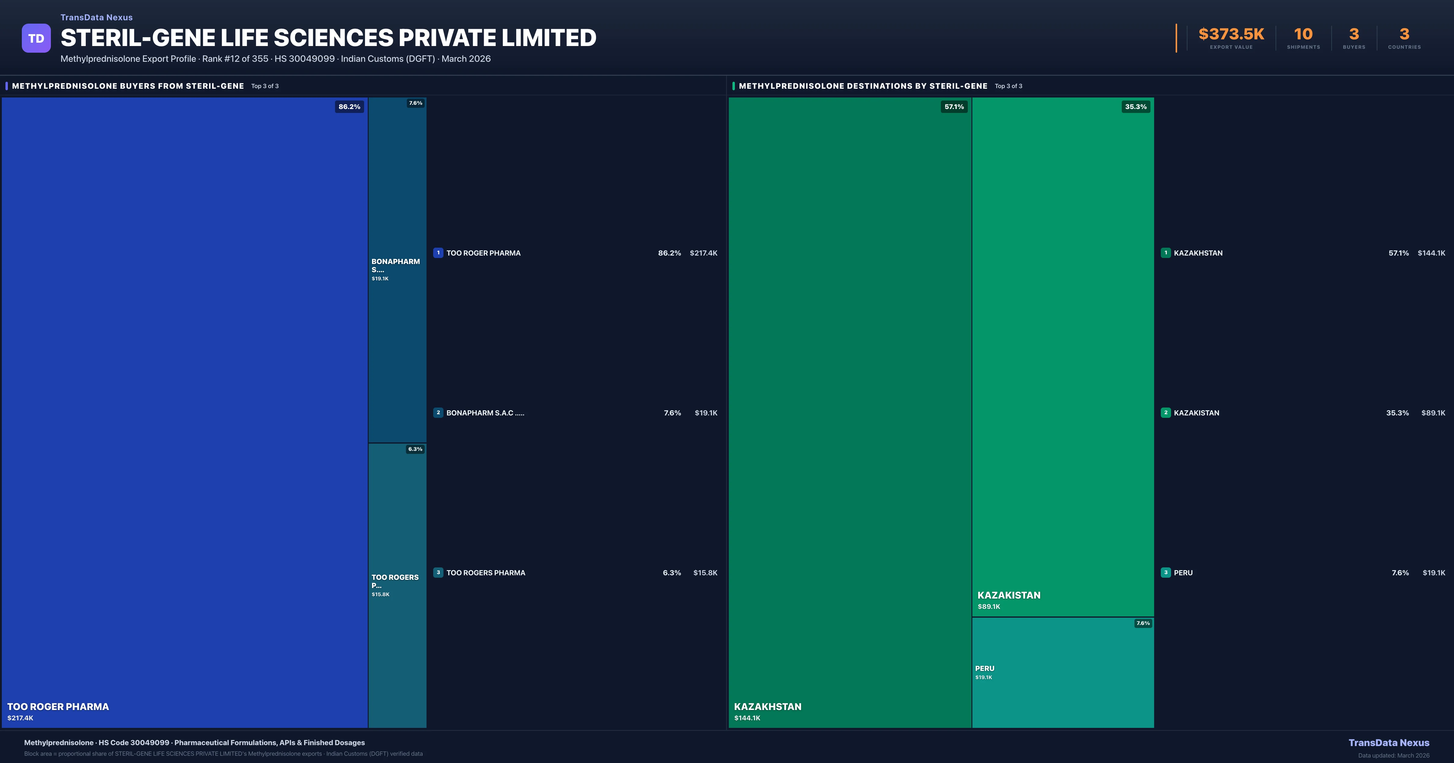 Steril-gene Life Sciences Private Limited supplies Methylprednisolone to 3 buyers globally. The largest buyer is TOO ROGER PHARMA (KAZAKISTAN), followed by BONAPHARM S.A.C ..... (PERU) and TOO ROGERS PHARMA (KAZAKISTAN). These buyers represent pharmaceutical distributors, hospital groups, and government procurement agencies in their respective markets.