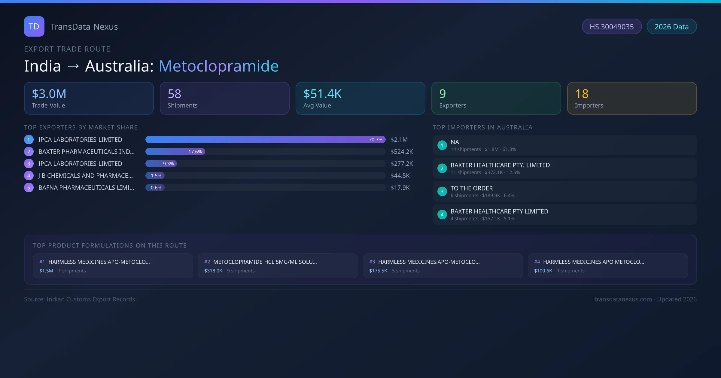 The leading Indian exporters of Metoclopramide to Australia are IPCA LABORATORIES LIMITED, BAXTER PHARMACEUTICALS INDIA PRIVATE LIMITED, IPCA LABORATORIES LIMITED . IPCA LABORATORIES LIMITED holds the largest market share at approximately 71% of total trade value on this route.