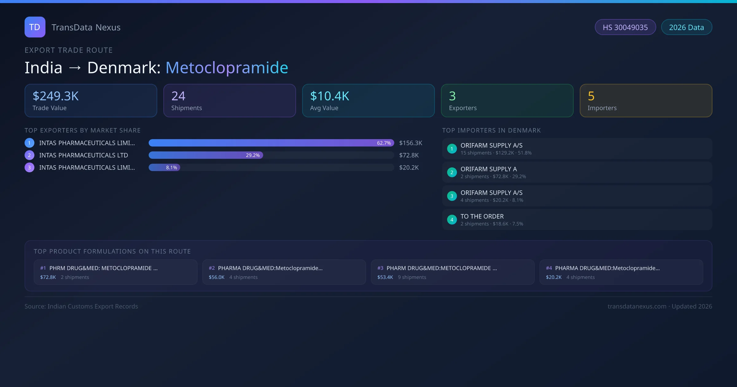 India has recorded 24 verified shipments of Metoclopramide exported to Denmark, representing a combined trade value of $249.3K USD. This corridor is served by 3 active Indian exporters, with an average shipment value of $10.4K USD. The leading Indian exporter is INTAS PHARMACEUTICALS LIMITED, which accounts for 63% of total export value with 18 shipments worth $156.3K USD. On the buying side, ORIFARM SUPPLY A/S is the largest importer in Denmark with $129.2K USD in purchases. The top 3 suppliers — INTAS PHARMACEUTICALS LIMITED, INTAS PHARMACEUTICALS LTD, INTAS PHARMACEUTICALS LIMITED — together control 100% of total trade value on this route. All data sourced from Indian Customs (DGFT) shipping bill records. Values reported in FOB USD.