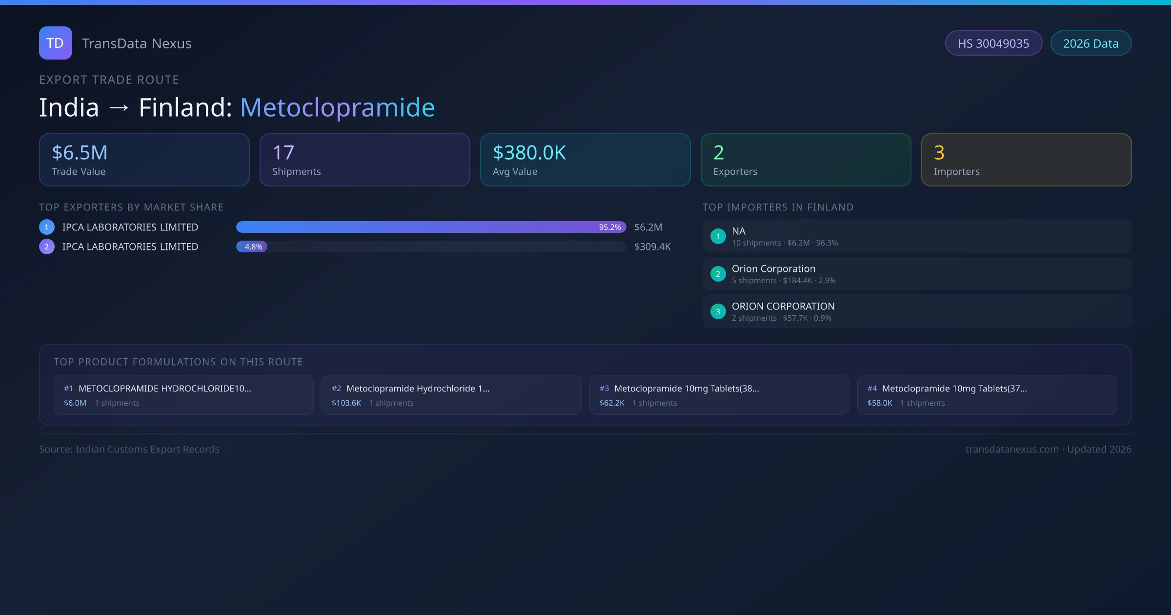 The leading Indian exporters of Metoclopramide to Finland are IPCA LABORATORIES LIMITED, IPCA LABORATORIES LIMITED . IPCA LABORATORIES LIMITED holds the largest market share at approximately 95% of total trade value on this route.