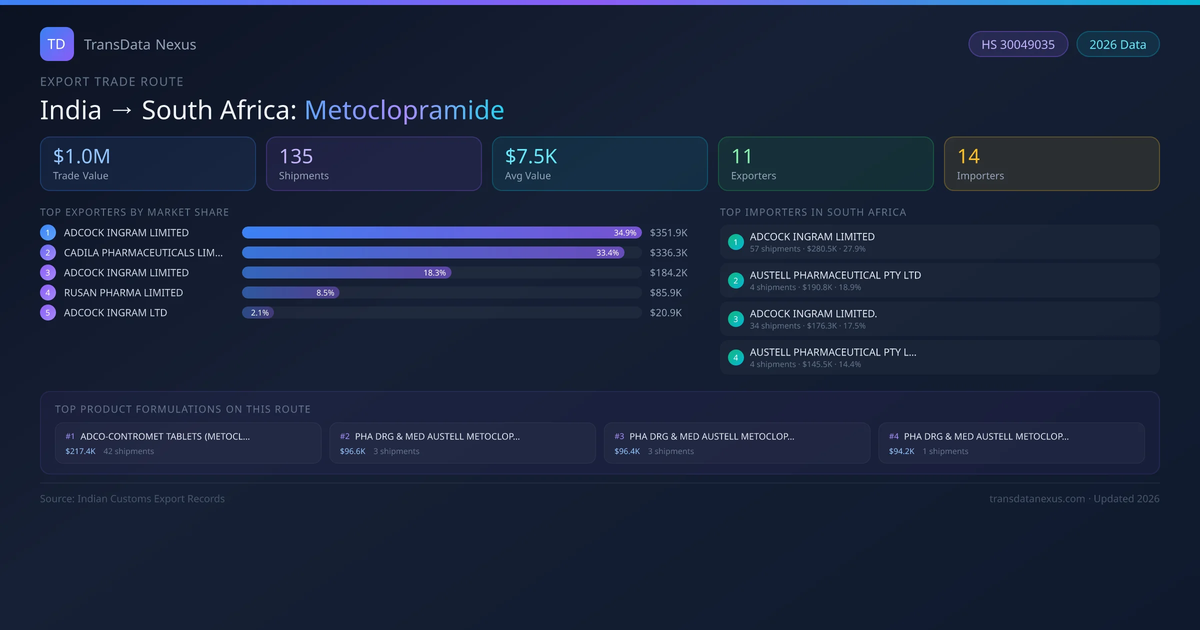 The India to South Africa Metoclopramide corridor is one of India's established pharmaceutical export routes, with 135 shipments documented worth a combined $1.0M USD. The route is dominated by ADCOCK INGRAM LIMITED, which alone accounts for roughly 35% of all export value, reflecting the consolidated nature of India's metoclopramide manufacturing sector.