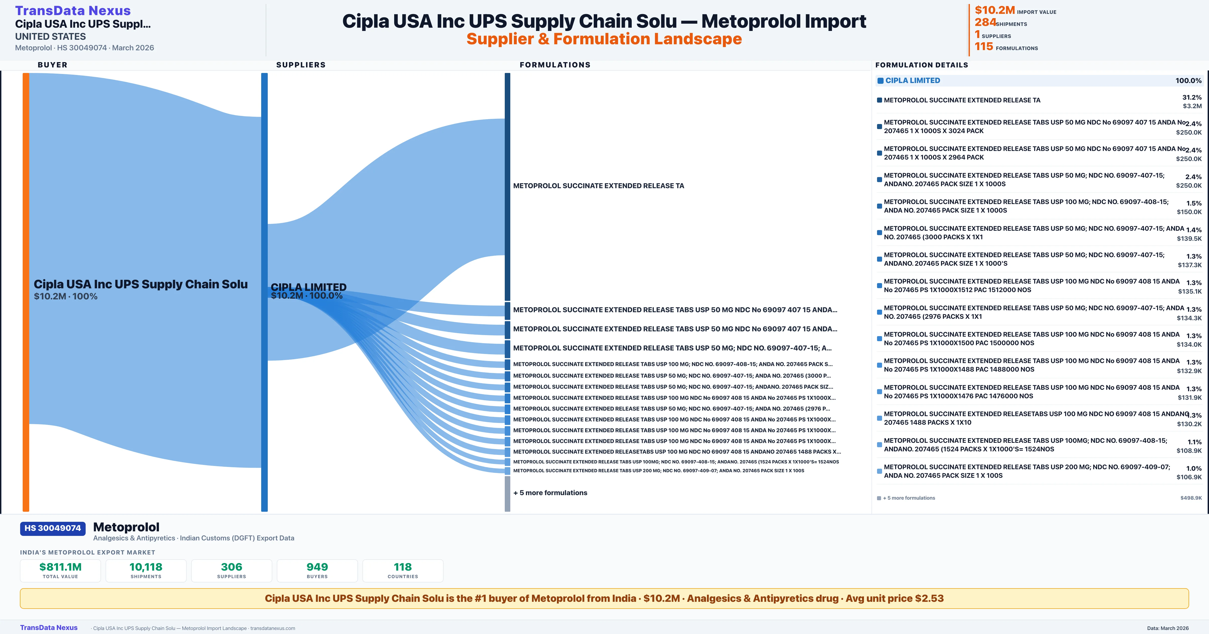 CIPLA USA INC UPS SUPPLY CHAIN SOLU sources Metoprolol from 1 verified Indian supplier based on 284 customs records. The primary supplier is CIPLA LIMITED accounting for 100.0% of imports.