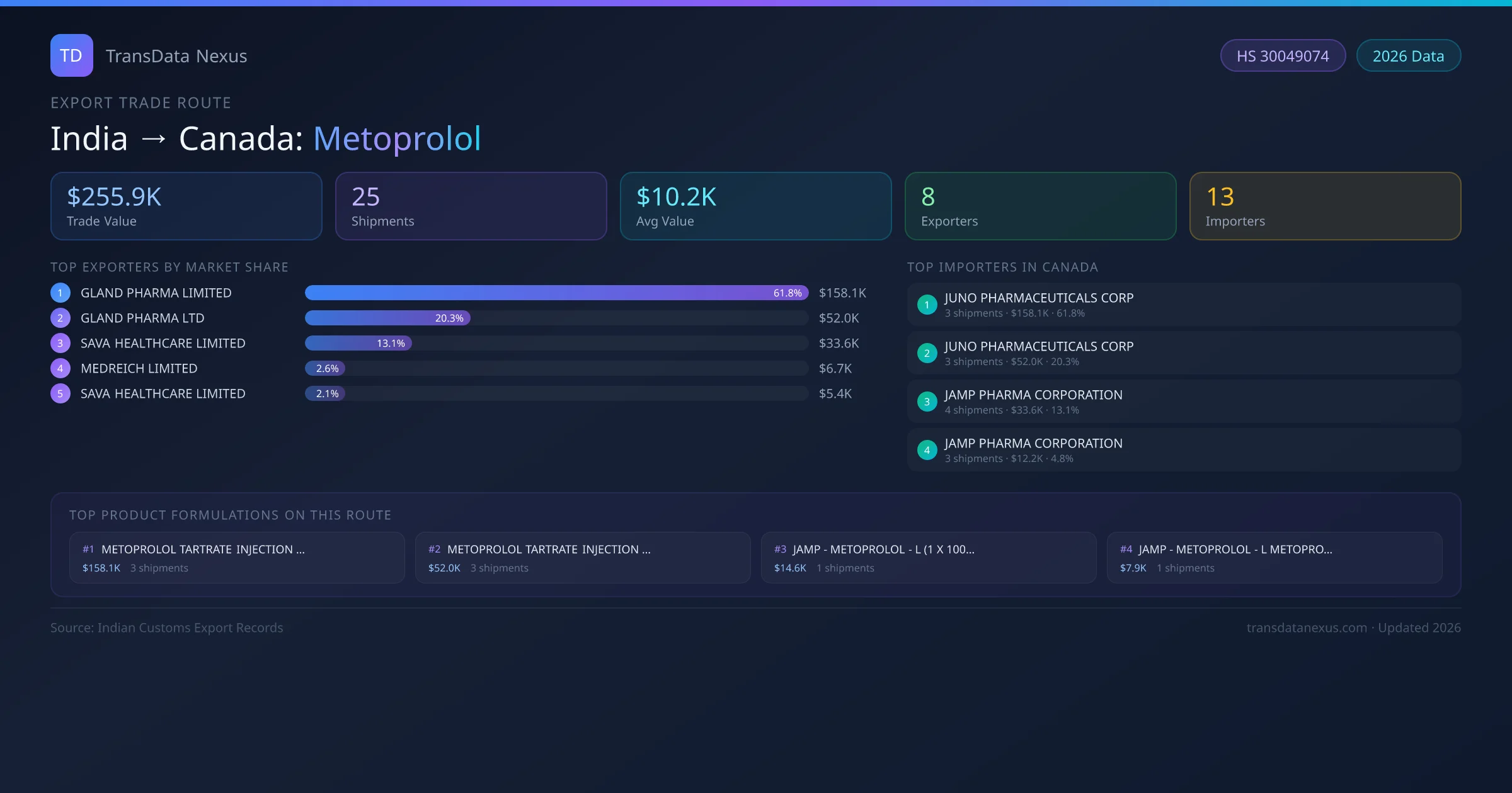 - 1.Route Identification: India to Canada export trade corridor identified from Indian Customs (DGFT) records for Metoprolol.