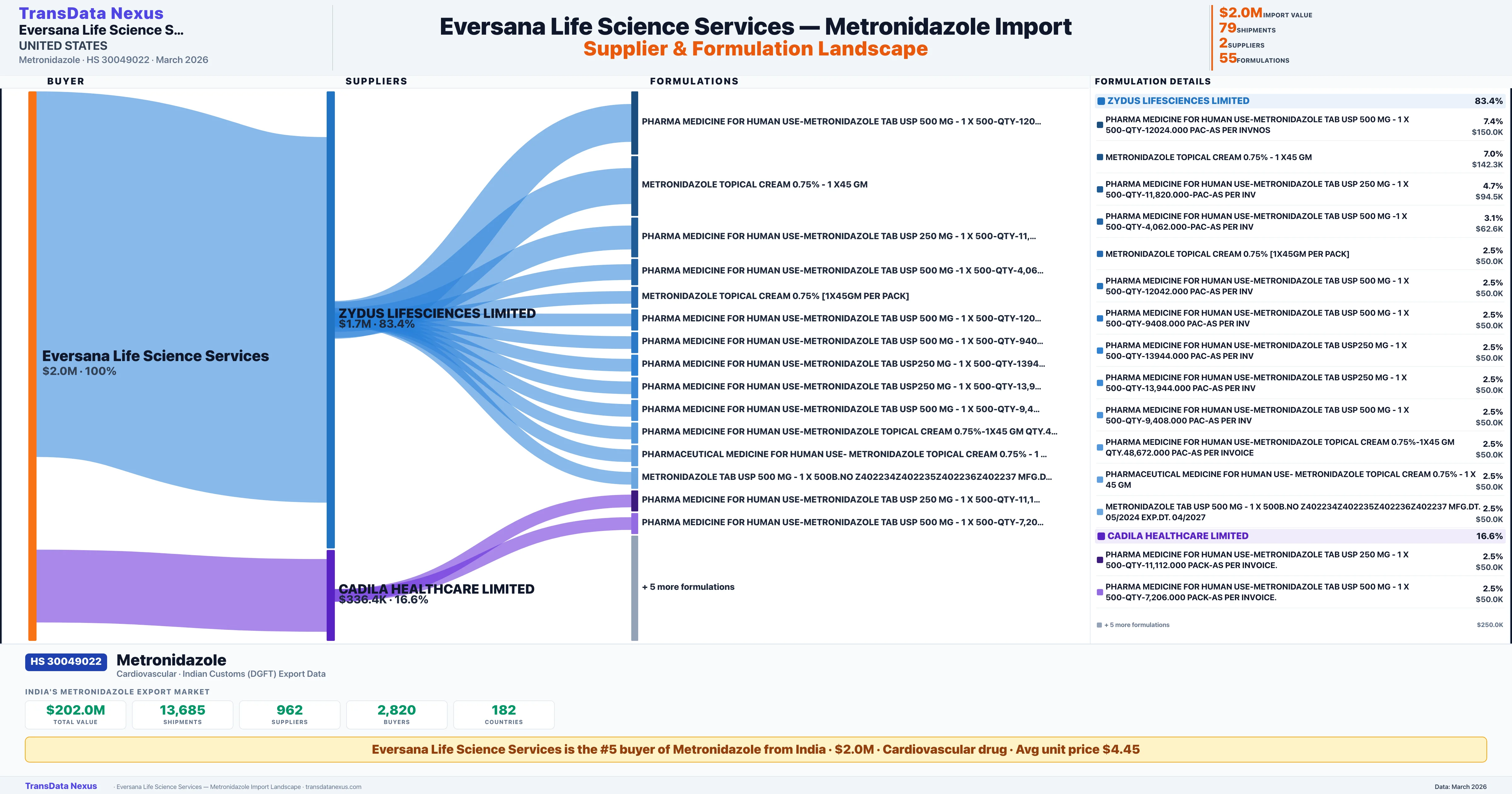 EVERSANA LIFE SCIENCE SERVICES sources Metronidazole from 2 verified Indian suppliers: ZYDUS LIFESCIENCES LIMITED ($1.7M, 83.4%), CADILA HEALTHCARE LIMITED ($336.4K, 16.6%). This is based on 79 customs records.