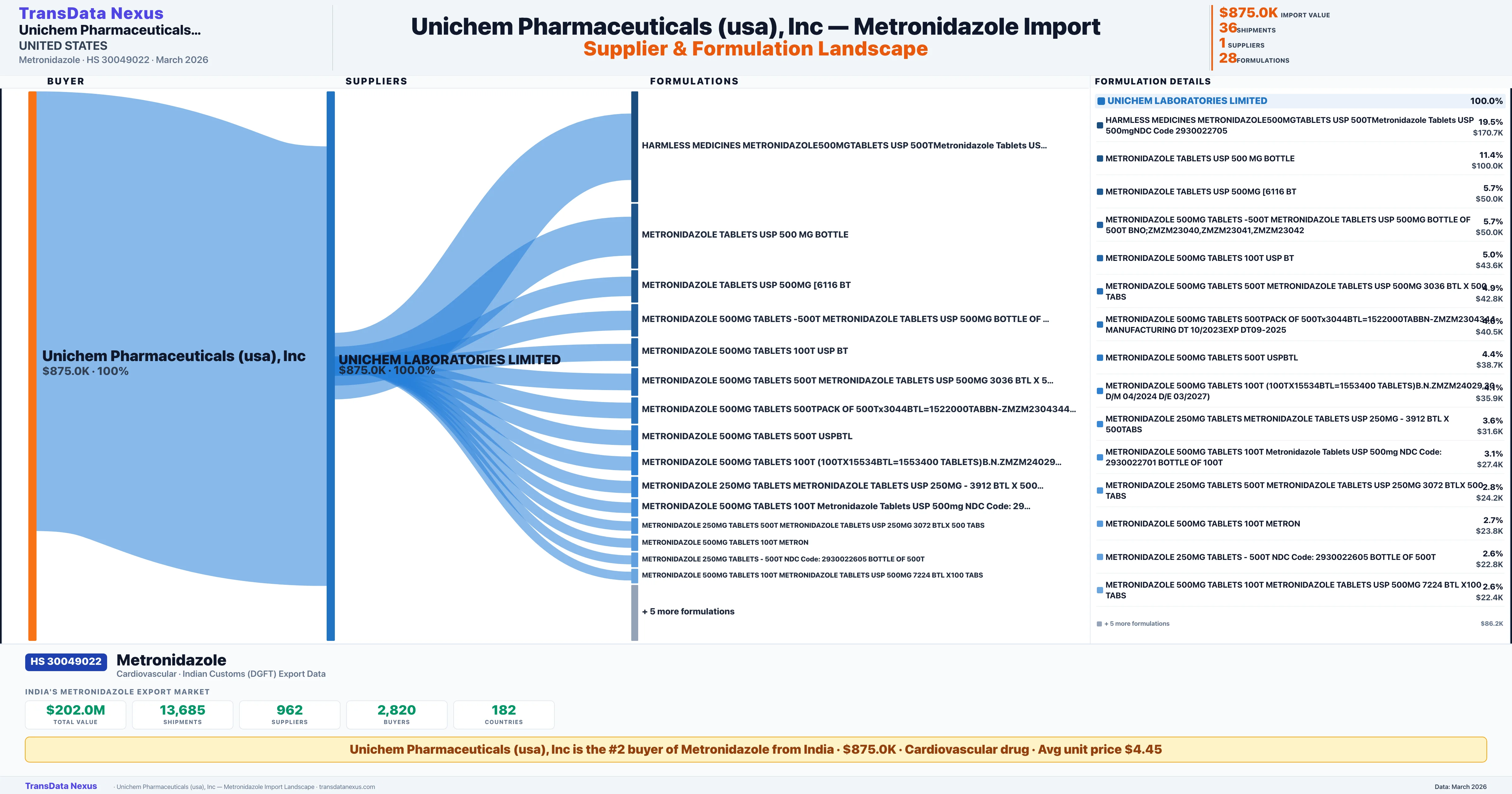 UNICHEM PHARMACEUTICALS (USA) INC. β Metronidazole Import Profile: Suppliers, Formulations & Sources