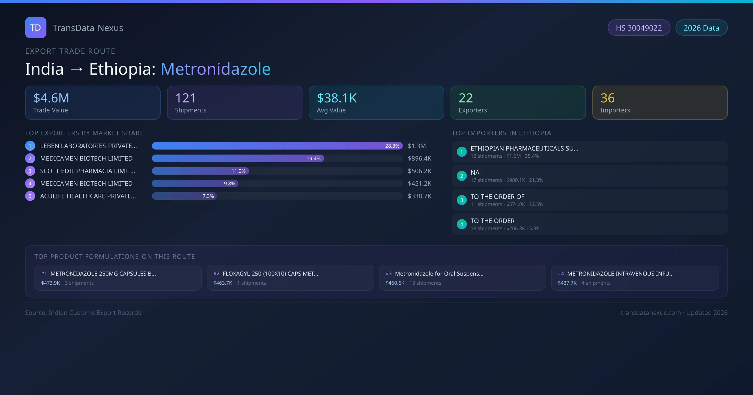 - 1.Route Identification: India to Ethiopia export trade corridor identified from Indian Customs (DGFT) records for Metronidazole.