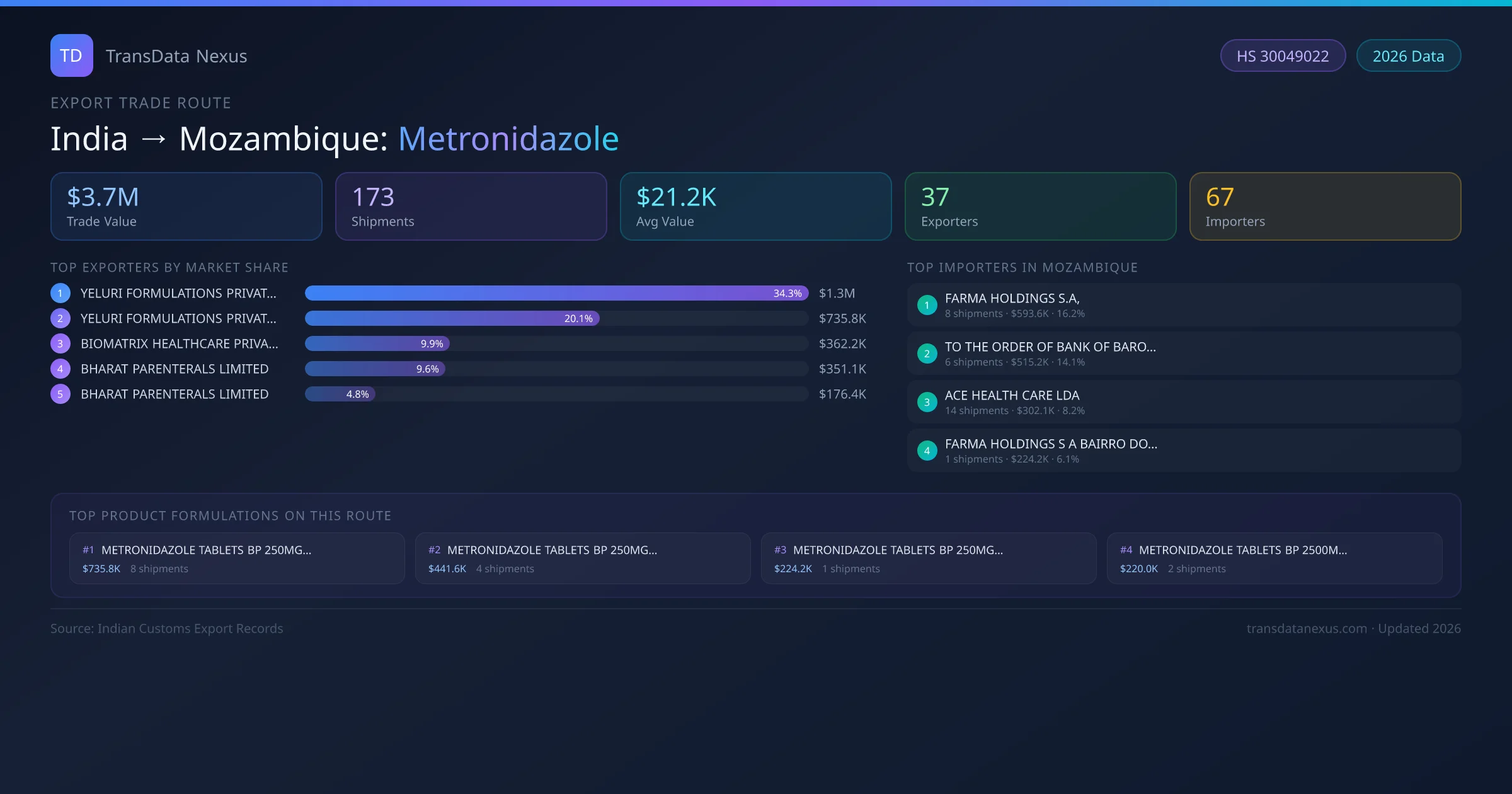 The India to Mozambique Metronidazole corridor is one of India's established pharmaceutical export routes, with 173 shipments documented worth a combined $3.7M USD. The route is dominated by YELURI FORMULATIONS PRIVATE LIMITED, which alone accounts for roughly 34% of all export value, reflecting the consolidated nature of India's metronidazole manufacturing sector.