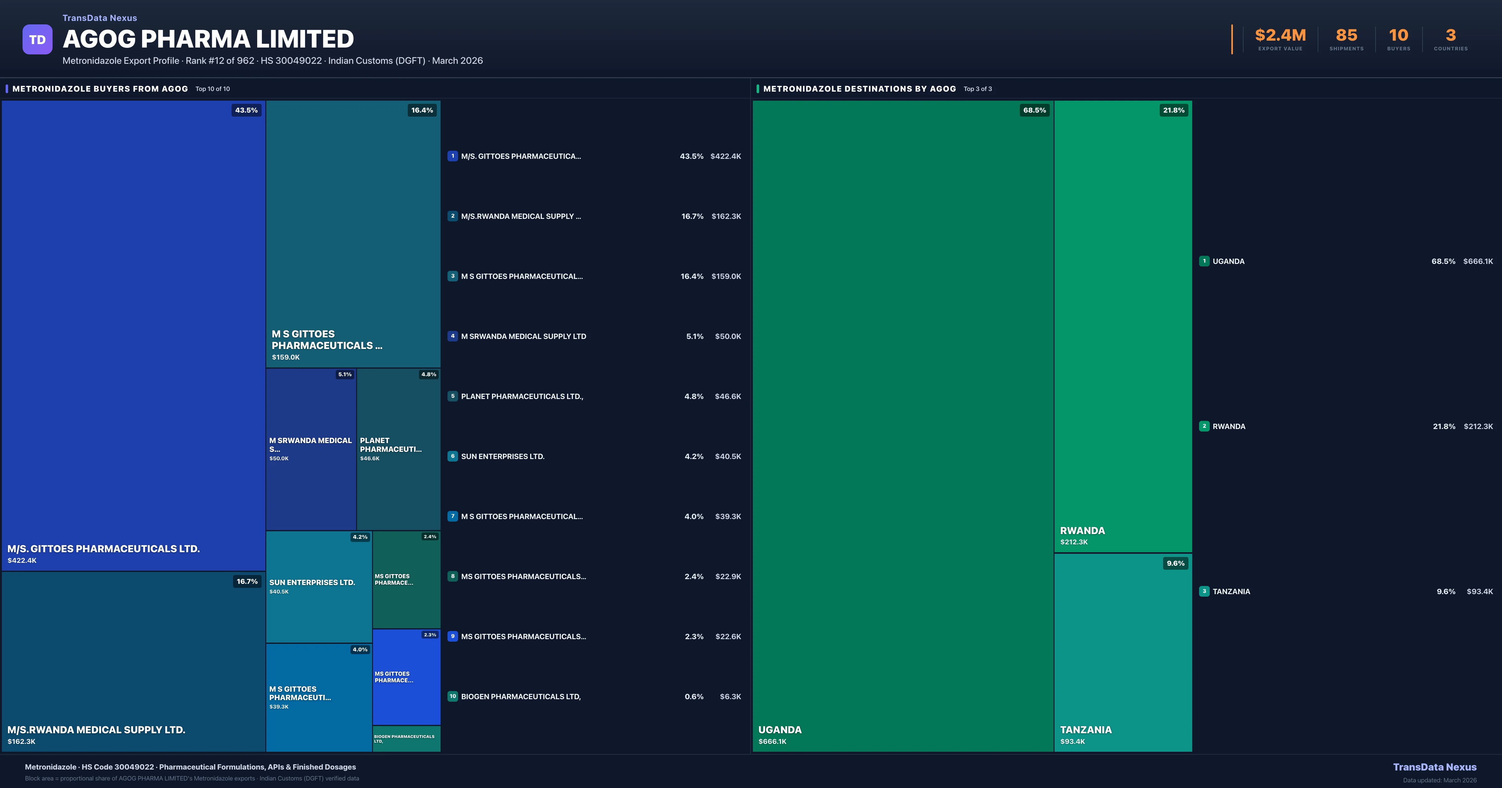 Agog Pharma Limited's average Metronidazole shipment value is $28.5K per consignment, based on 85 shipments totaling $2.4M. The largest destination is UGANDA (68.5% of Agog Pharma Limited's Metronidazole exports).