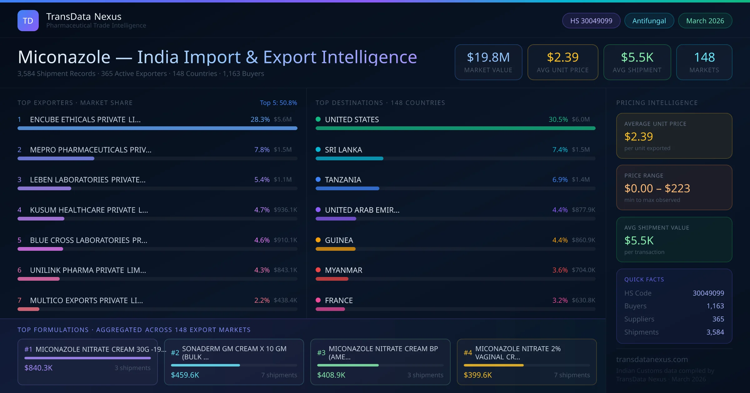 1,163 buyers import miconazole from India across 148 countries. The repeat buyer rate is 48.2%, indicating strong ongoing trade relationships.