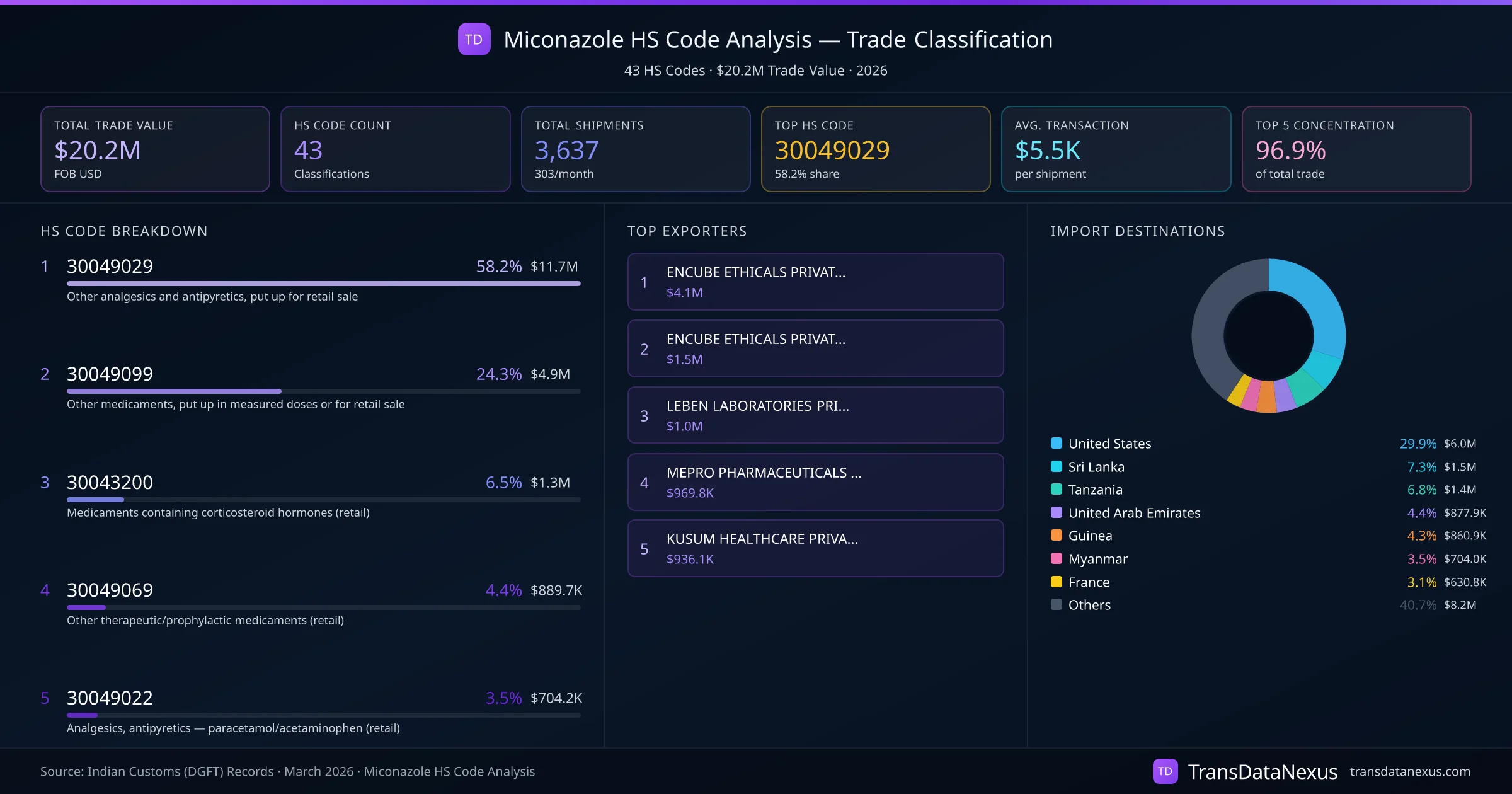 India exports Miconazole under 43 distinct HS code classifications, representing a total trade value of $20.2M across 3,637 shipments. The dominant classification is HS 30049029 (Other analgesics and antipyretics, put up for retail sale), accounting for 58.2% of all Miconazole trade at $11.7M. HS 30049099 (Other medicaments, put up in measured doses or for retail sale) follows at 24.3% ($4.9M). The top 5 HS codes together account for 96.9% of total Miconazole trade from India. The average transaction value is $5543. Key importing markets include United States, Sri Lanka, Tanzania. Leading exporters include ENCUBE ETHICALS PRIVATE LIMITED and ENCUBE ETHICALS PRIVATE LIMITED . Data sourced from Indian Customs (DGFT) shipping bill records.