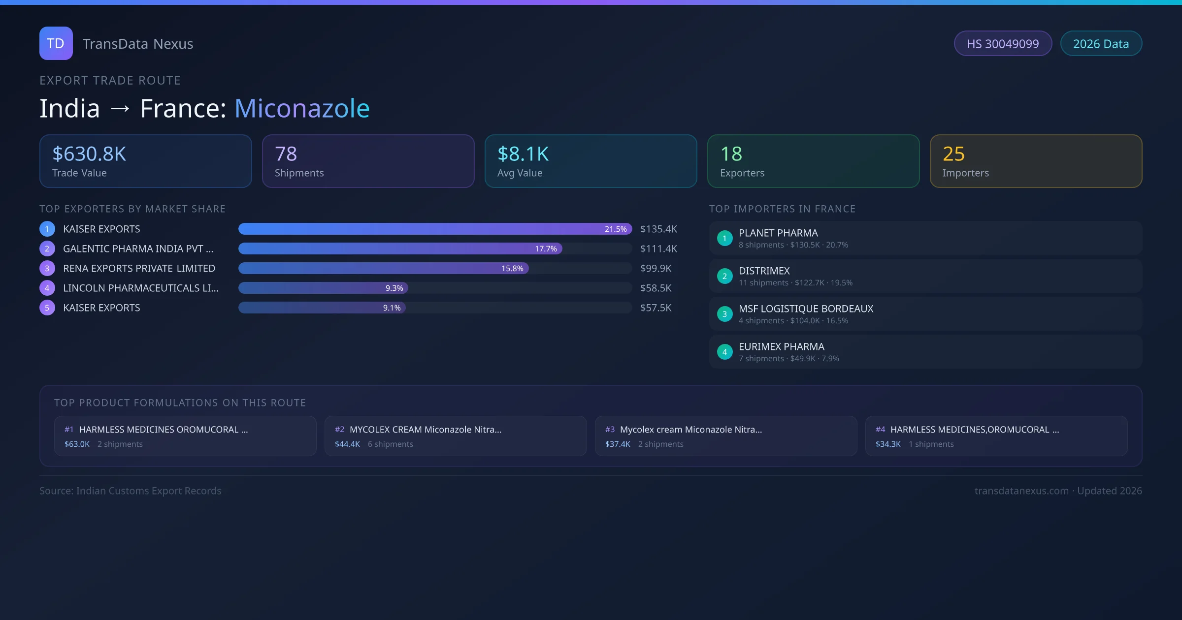 India has recorded 78 verified shipments of Miconazole exported to France, representing a combined trade value of $630.8K USD. This corridor is served by 18 active Indian exporters, with an average shipment value of $8.1K USD. The leading Indian exporter is KAISER EXPORTS, which accounts for 21% of total export value with 14 shipments worth $135.4K USD. On the buying side, PLANET PHARMA is the largest importer in France with $130.5K USD in purchases. The top 3 suppliers — KAISER EXPORTS, GALENTIC PHARMA INDIA PVT LTD, RENA EXPORTS PRIVATE LIMITED — together control 55% of total trade value on this route. All data sourced from Indian Customs (DGFT) shipping bill records. Values reported in FOB USD.