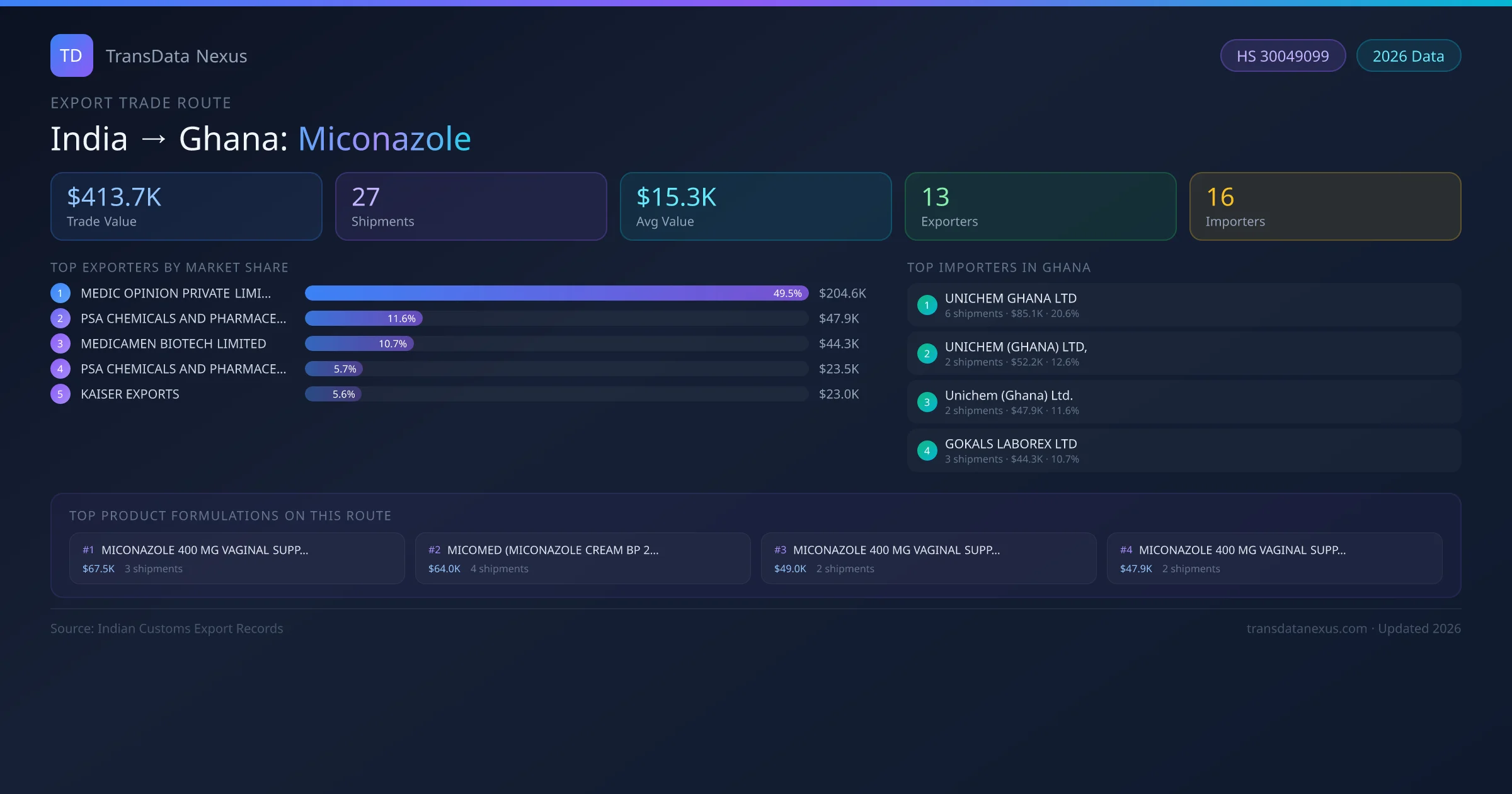 - 1.Route Identification: India to Ghana export trade corridor identified from Indian Customs (DGFT) records for Miconazole.