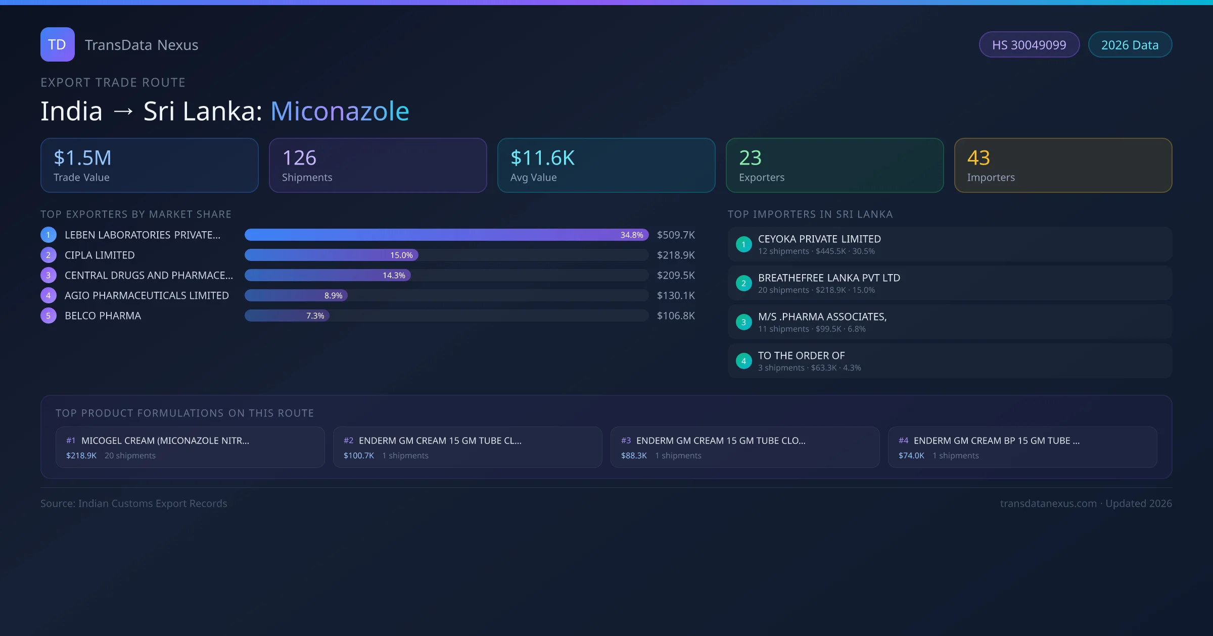 The India to Sri Lanka Miconazole corridor is one of India's established pharmaceutical export routes, with 126 shipments documented worth a combined $1.5M USD. The route is dominated by LEBEN LABORATORIES PRIVATE LIMITED, which alone accounts for roughly 35% of all export value, reflecting the consolidated nature of India's miconazole manufacturing sector.