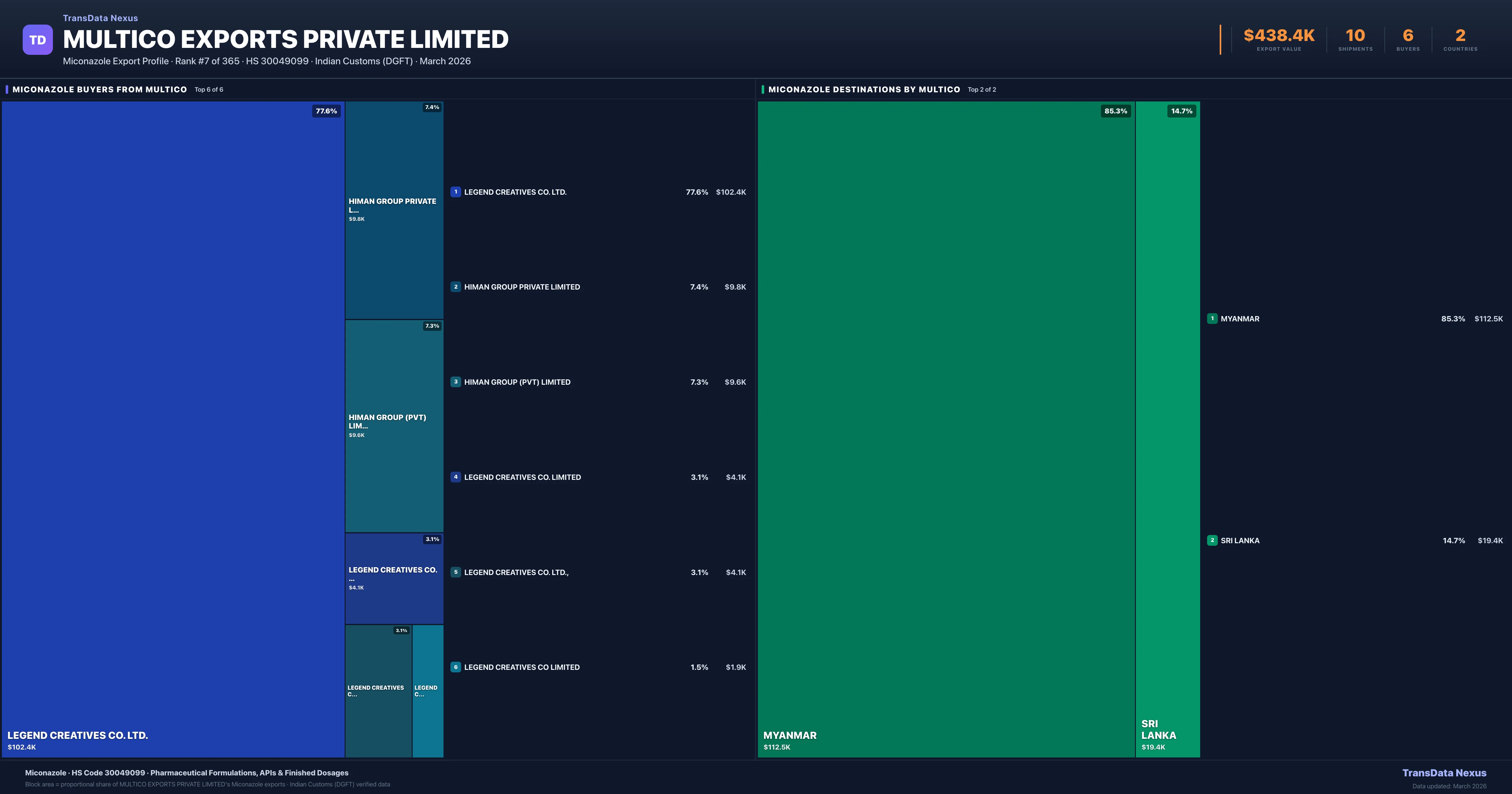 Multico Exports Private Limited supplies Miconazole to 6 buyers globally. The largest buyer is LEGEND CREATIVES CO. LTD. (MYANMAR), followed by HIMAN GROUP PRIVATE LIMITED (SRI LANKA) and HIMAN GROUP (PVT) LIMITED (SRI LANKA). These buyers represent pharmaceutical distributors, hospital groups, and government procurement agencies in their respective markets.