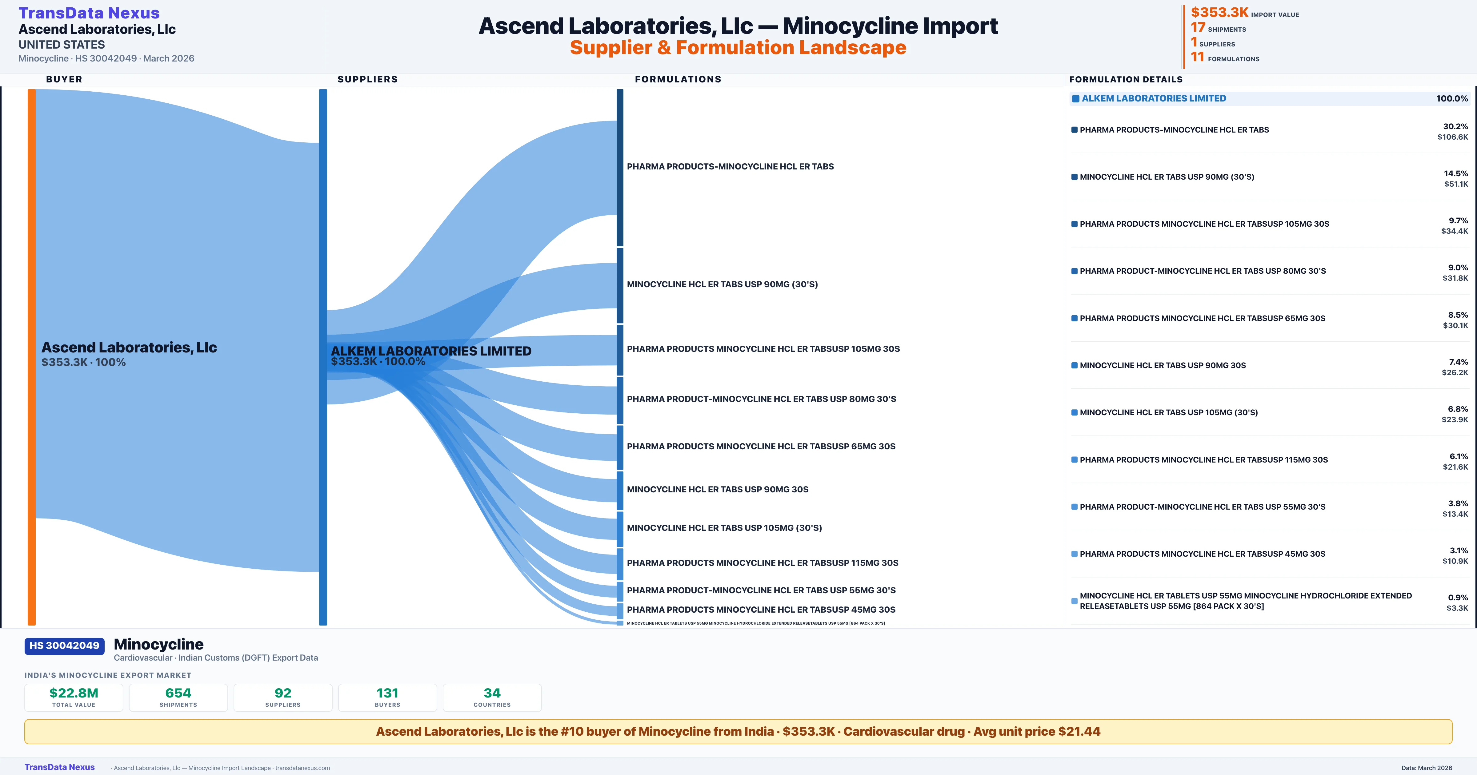 ASCEND LABORATORIES LLC sources Minocycline from 1 verified Indian supplier: ALKEM LABORATORIES LIMITED ($353.3K, 100.0%). This is based on 17 customs records.