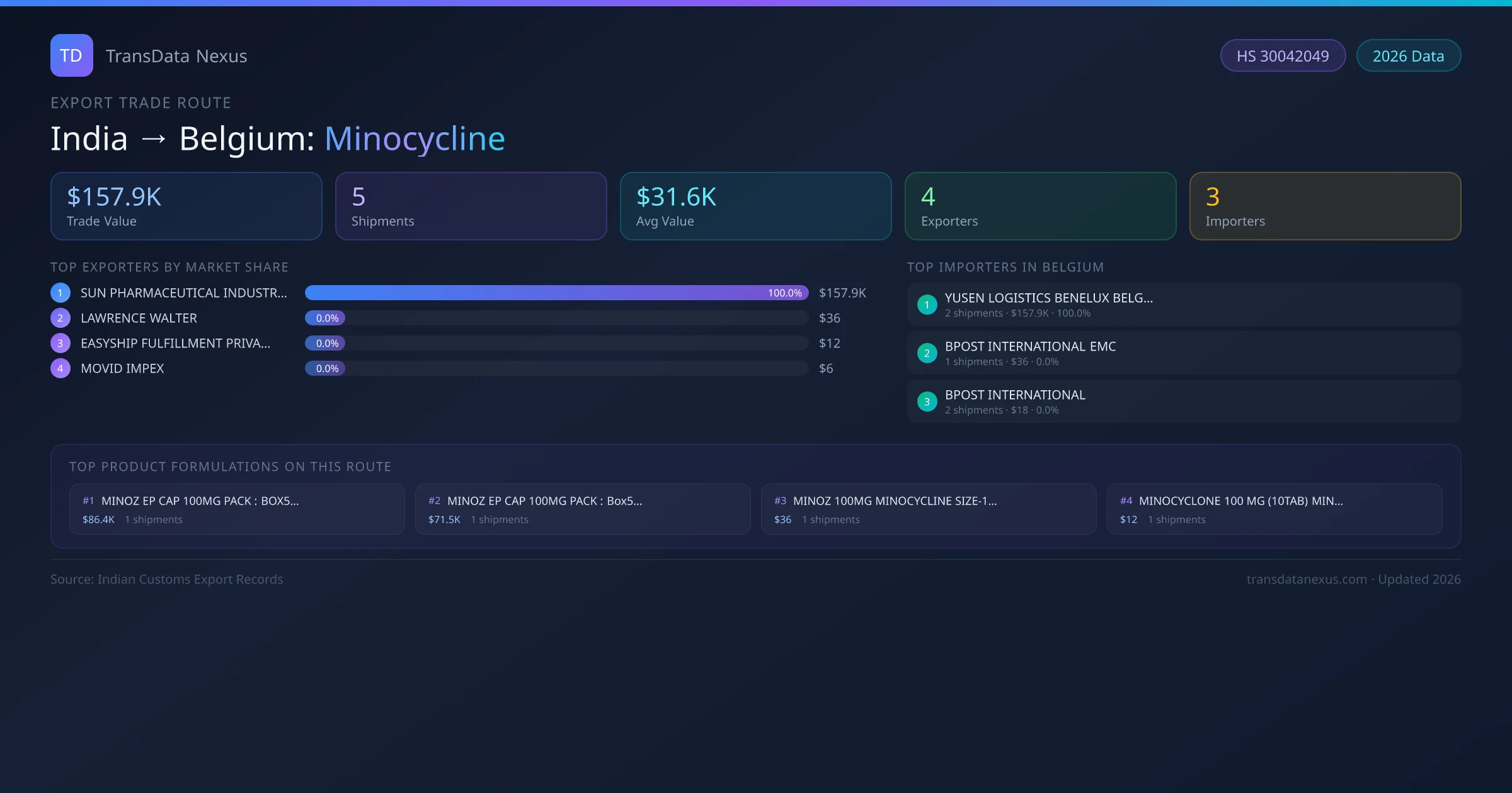 The India to Belgium Minocycline corridor is one of India's established pharmaceutical export routes, with 5 shipments documented worth a combined $157.9K USD. The route is dominated by SUN PHARMACEUTICAL INDUSTRIES LIMITED, which alone accounts for roughly 100% of all export value, reflecting the consolidated nature of India's minocycline manufacturing sector.