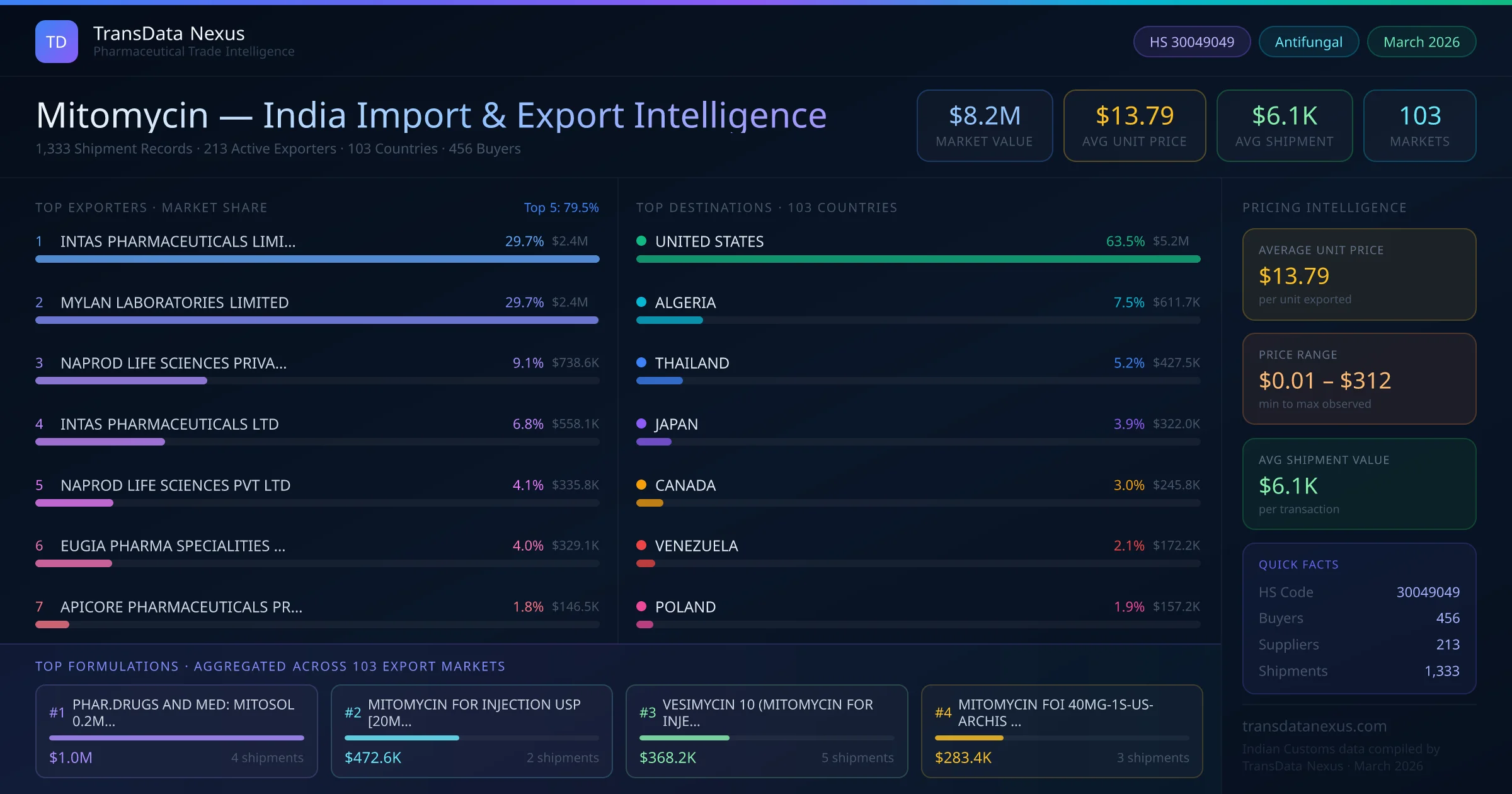 Between 2022 and 2026, India exported $8.2M worth of mitomycin across 1,333 verified shipments to 103 countries — covering 53% of world markets in the Advanced Oncology segment. The largest destination is UNITED STATES (63.5%). INTAS PHARMACEUTICALS LIMITED leads with a 29.7% share. All figures are drawn from Indian Customs (DGFT) shipping bill records spanning four years of trade activity.