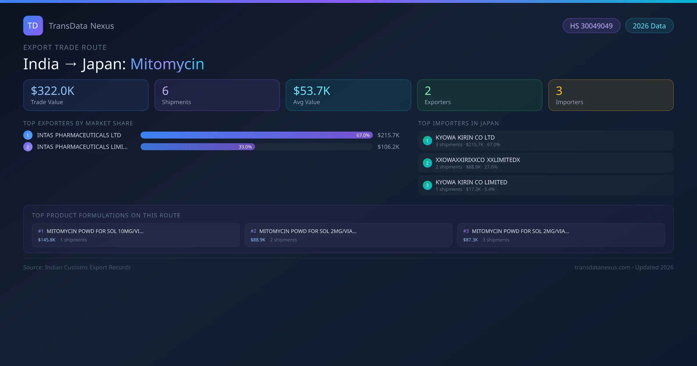 India has recorded 6 verified shipments of Mitomycin exported to Japan, representing a combined trade value of $322.0K USD. This corridor is served by 2 active Indian exporters, with an average shipment value of $53.7K USD. The leading Indian exporter is INTAS PHARMACEUTICALS LTD, which accounts for 67% of total export value with 3 shipments worth $215.7K USD. On the buying side, KYOWA KIRIN CO LTD is the largest importer in Japan with $215.7K USD in purchases. All data sourced from Indian Customs (DGFT) shipping bill records. Values reported in FOB USD.
