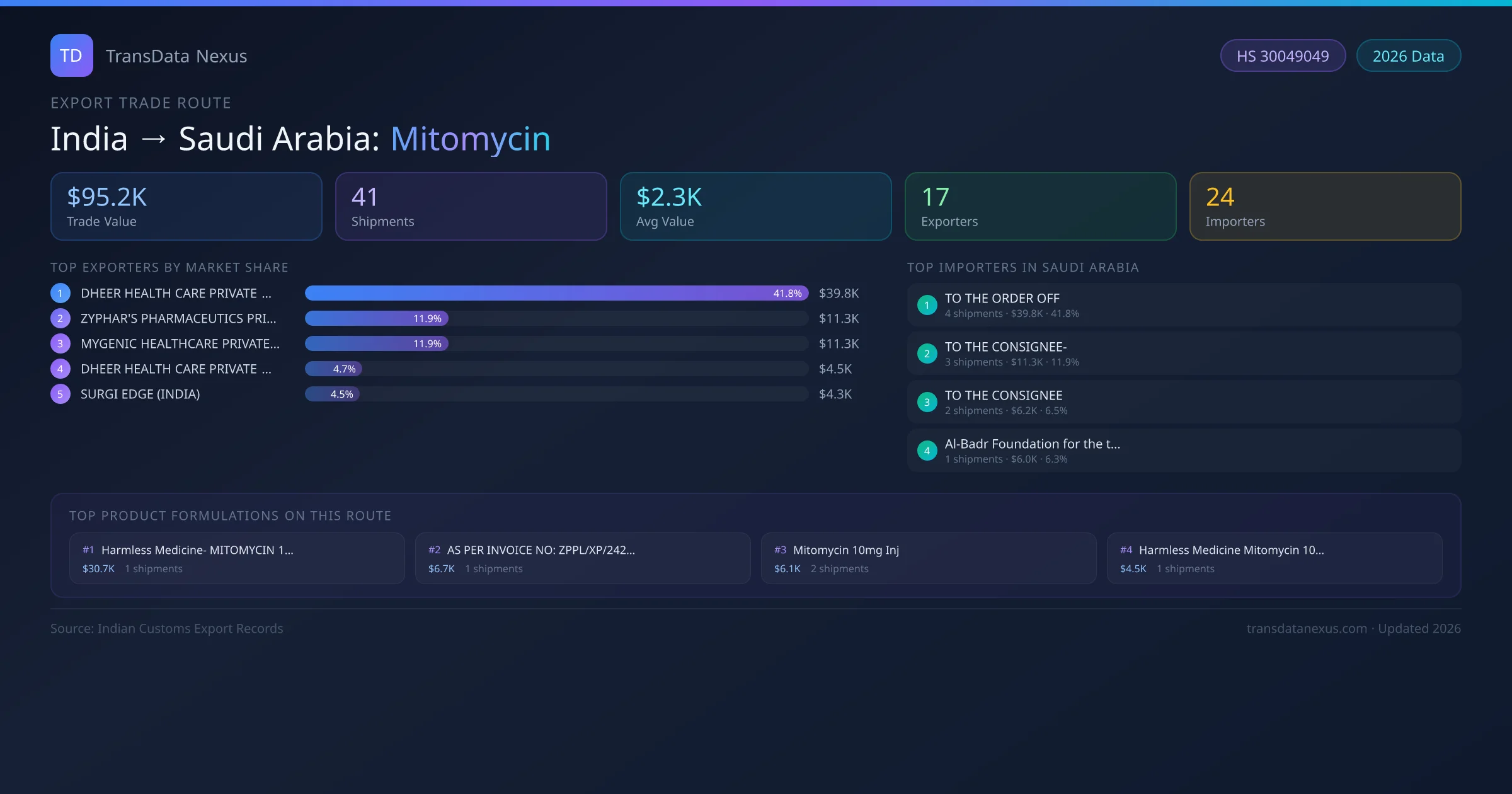 - 1.Route Identification: India to Saudi Arabia export trade corridor identified from Indian Customs (DGFT) records for Mitomycin.