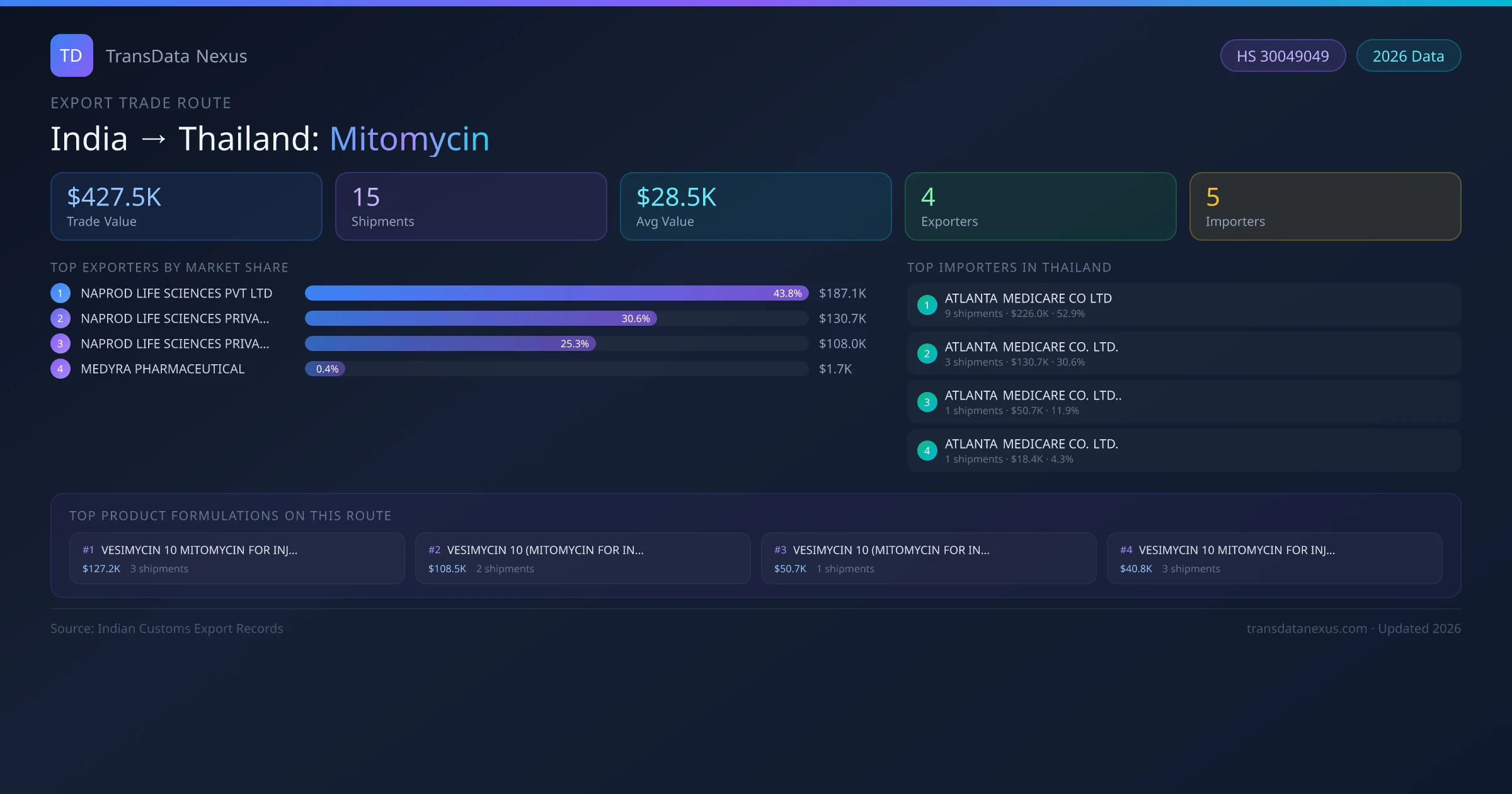 India has recorded 15 verified shipments of Mitomycin exported to Thailand, representing a combined trade value of $427.5K USD. This corridor is served by 4 active Indian exporters, with an average shipment value of $28.5K USD. The leading Indian exporter is NAPROD LIFE SCIENCES PVT LTD, which accounts for 44% of total export value with 7 shipments worth $187.1K USD. On the buying side, ATLANTA MEDICARE CO LTD is the largest importer in Thailand with $226.0K USD in purchases. The top 3 suppliers — NAPROD LIFE SCIENCES PVT LTD, NAPROD LIFE SCIENCES PRIVATE LIMITED , NAPROD LIFE SCIENCES PRIVATE LIMITED — together control 100% of total trade value on this route. All data sourced from Indian Customs (DGFT) shipping bill records. Values reported in FOB USD.
