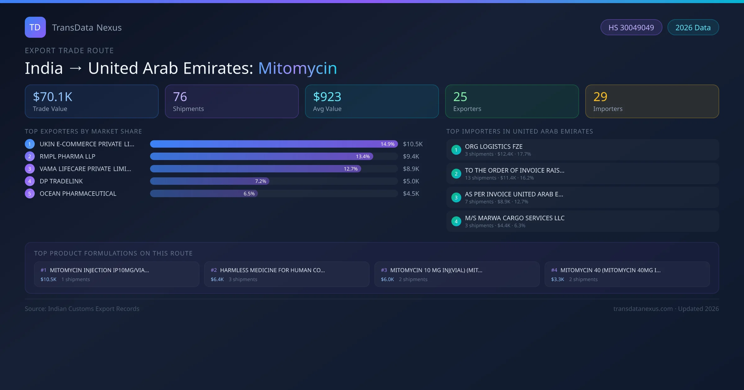 - 1.Route Identification: India to United Arab Emirates export trade corridor identified from Indian Customs (DGFT) records for Mitomycin.