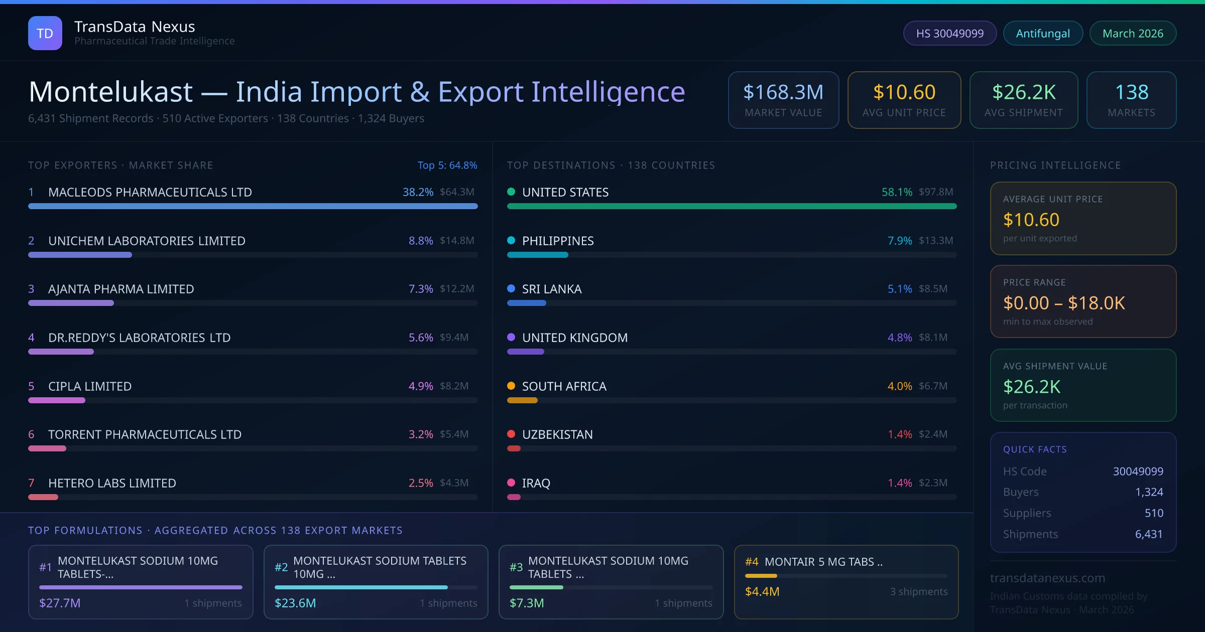 Between 2022 and 2026, India exported $168.3M worth of montelukast across 6,431 verified shipments to 138 countries — covering 71% of world markets in the Respiratory segment. The largest destination is UNITED STATES (58.1%). MACLEODS PHARMACEUTICALS LTD leads with a 38.2% share. All figures are drawn from Indian Customs (DGFT) shipping bill records spanning four years of trade activity.