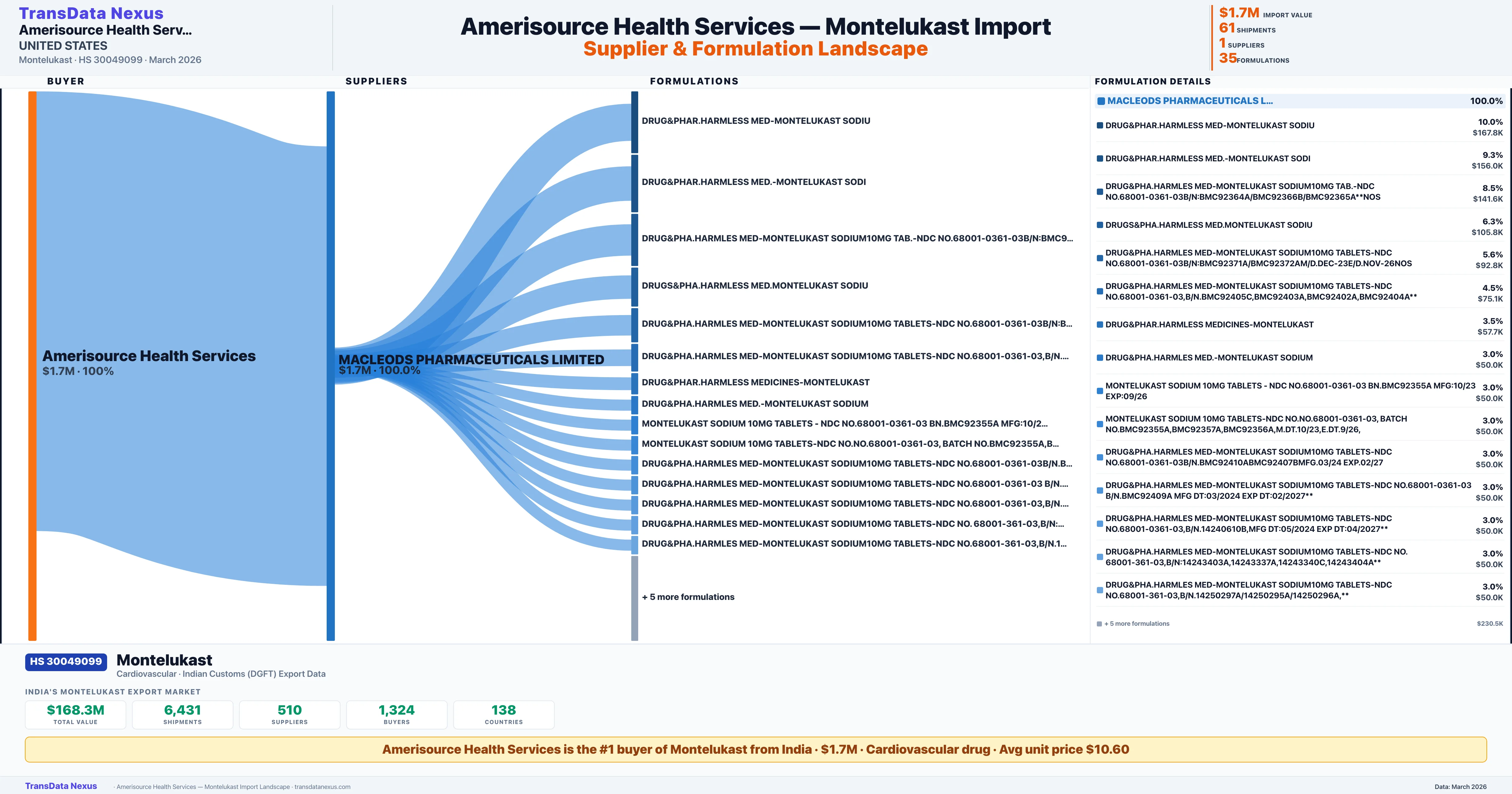 AMERISOURCE HEALTH SERVICES sources Montelukast from 1 verified Indian supplier: MACLEODS PHARMACEUTICALS LIMITED ($1.7M, 100.0%). This is based on 61 customs records.