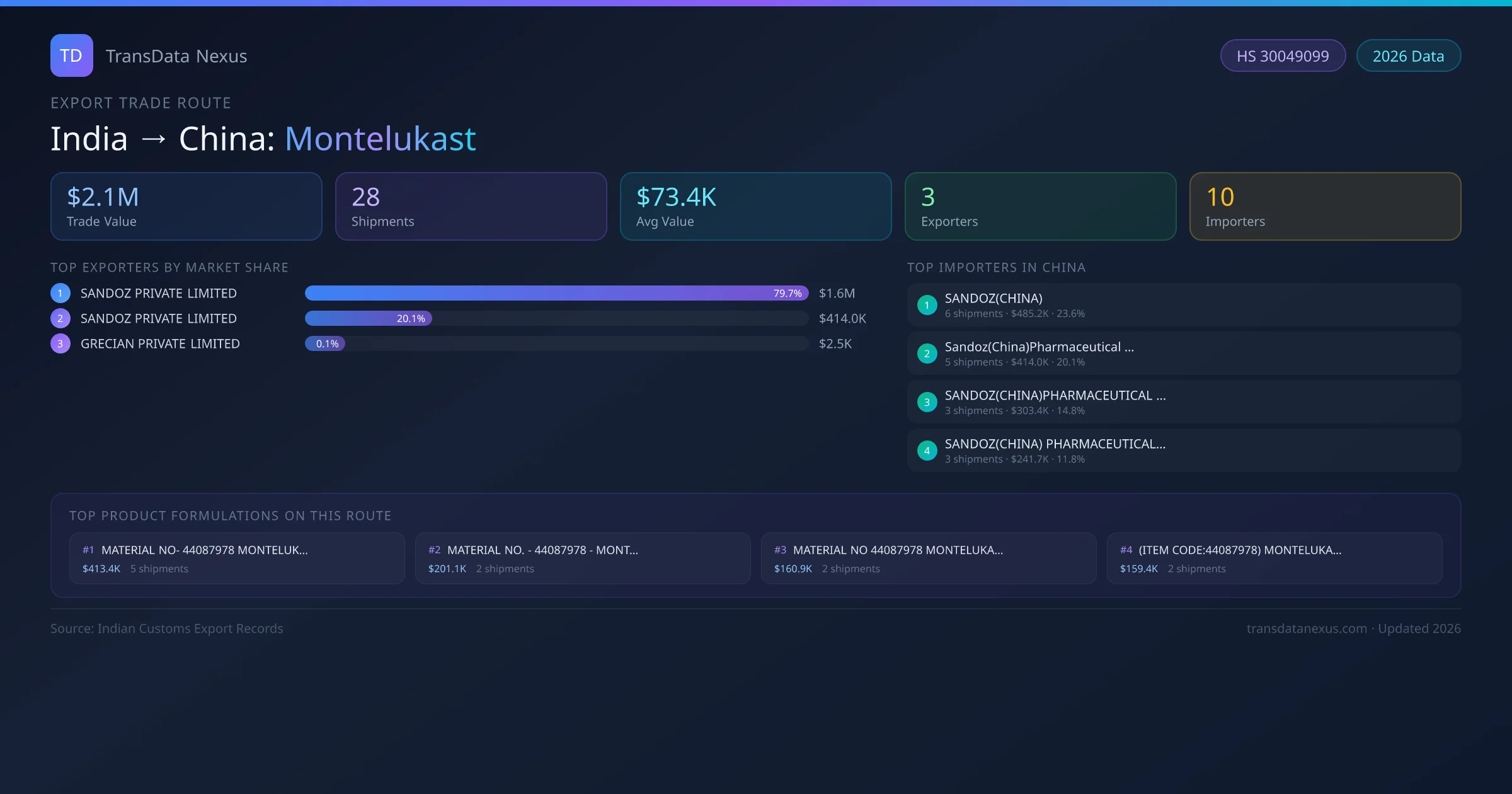 The India to China Montelukast corridor is one of India's established pharmaceutical export routes, with 28 shipments documented worth a combined $2.1M USD. The route is dominated by SANDOZ PRIVATE LIMITED, which alone accounts for roughly 80% of all export value, reflecting the consolidated nature of India's montelukast manufacturing sector.
