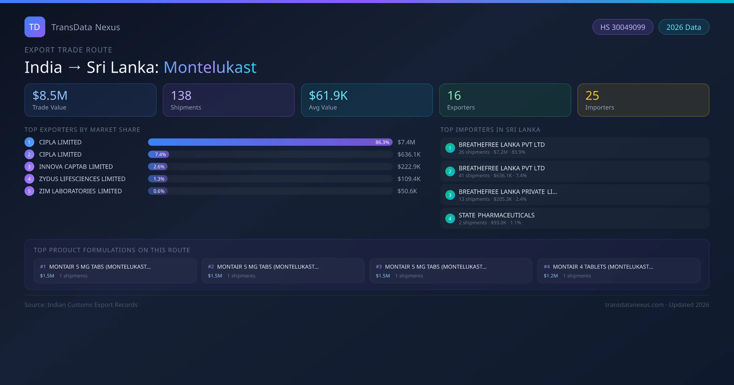 - 1.Route Identification: India to Sri Lanka export trade corridor identified from Indian Customs (DGFT) records for Montelukast.