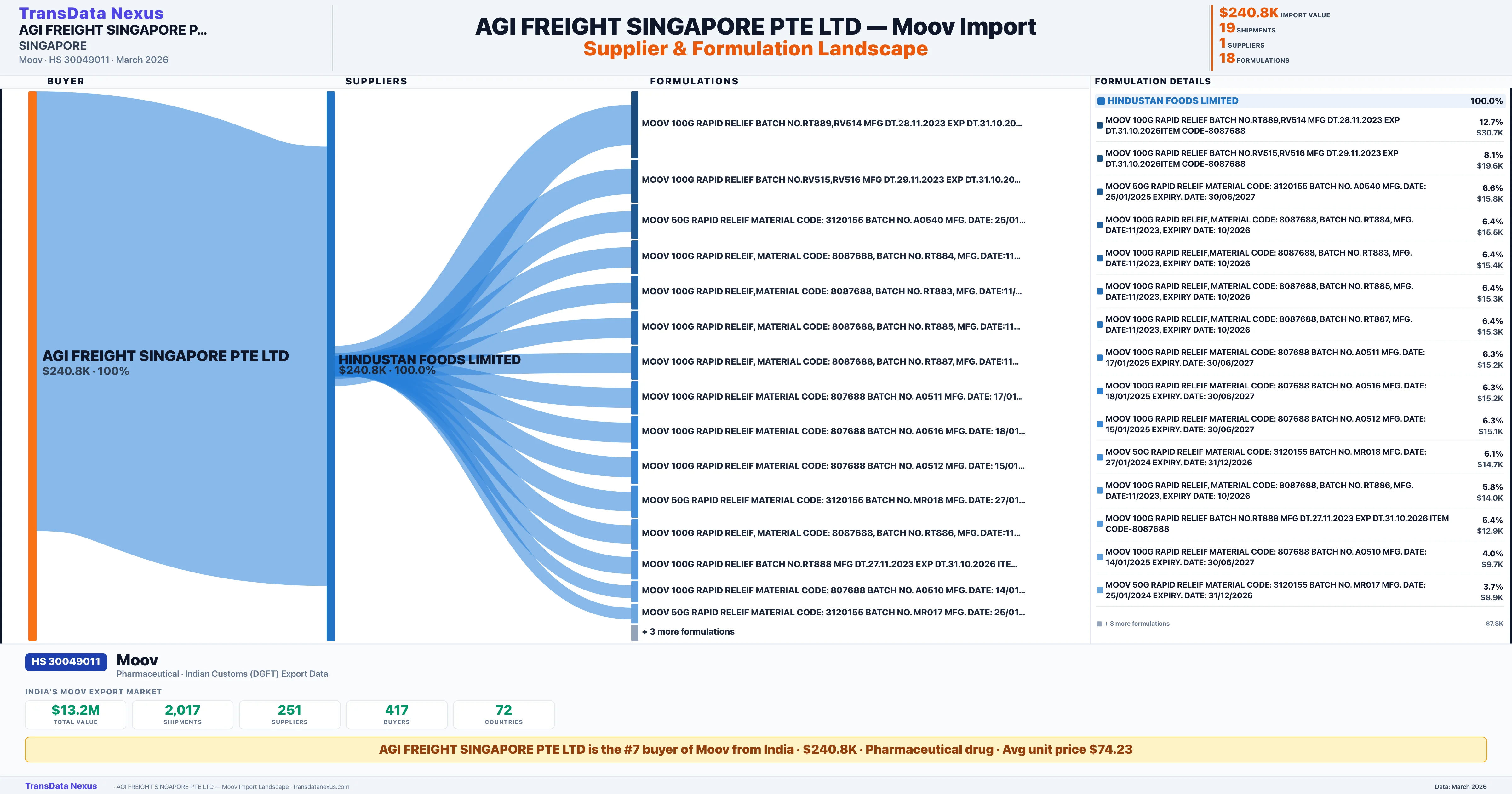 AGI FREIGHT SINGAPORE PTE LTD sources Moov from 1 verified Indian supplier: HINDUSTAN FOODS LIMITED ($240.8K, 100.0%). This is based on 19 customs records.