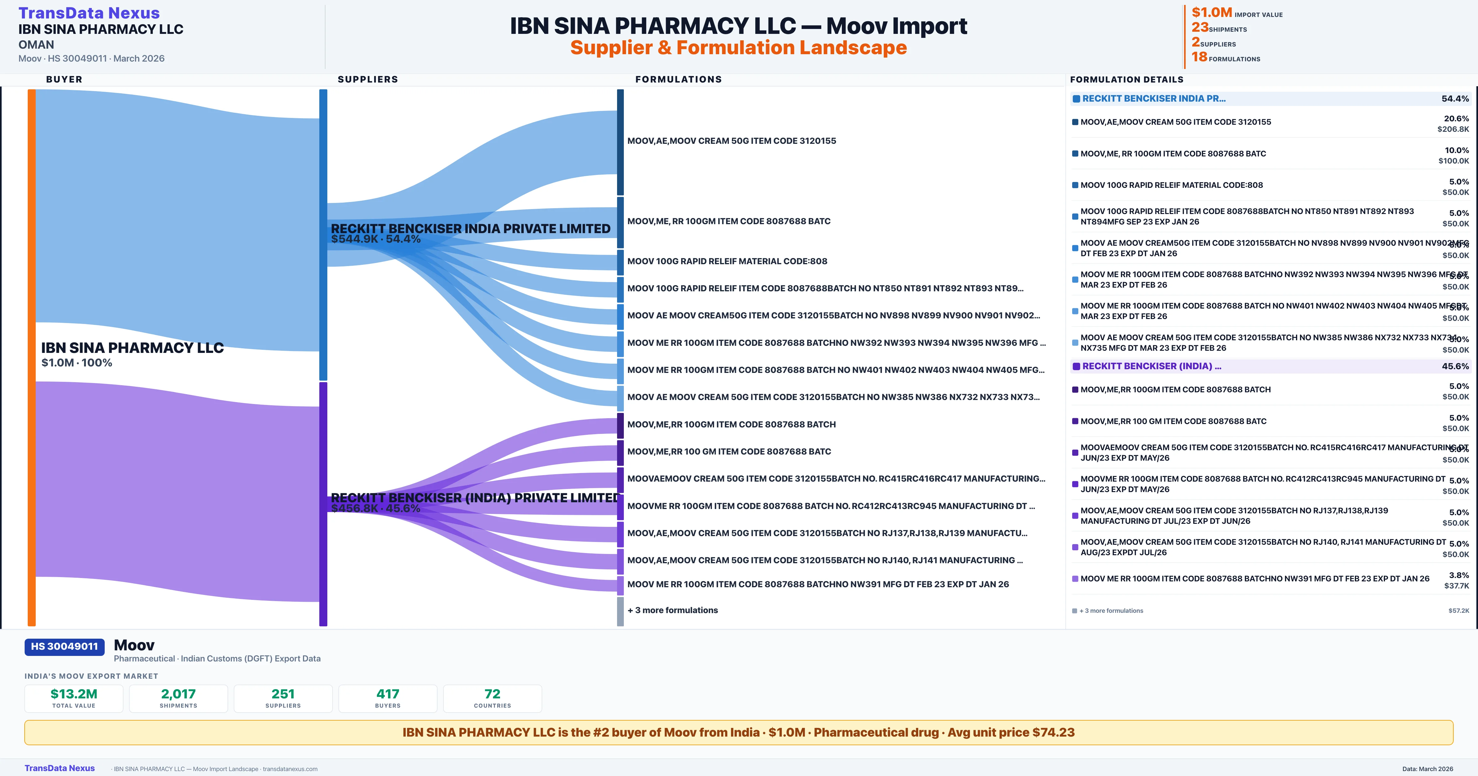 IBN SINA PHARMACY LLC sources Moov from 2 verified Indian suppliers: RECKITT BENCKISER INDIA PRIVATE LIMITED ($544.9K, 54.4%), RECKITT BENCKISER (INDIA) PRIVATE LIMITED ($456.8K, 45.6%). This is based on 23 customs records.