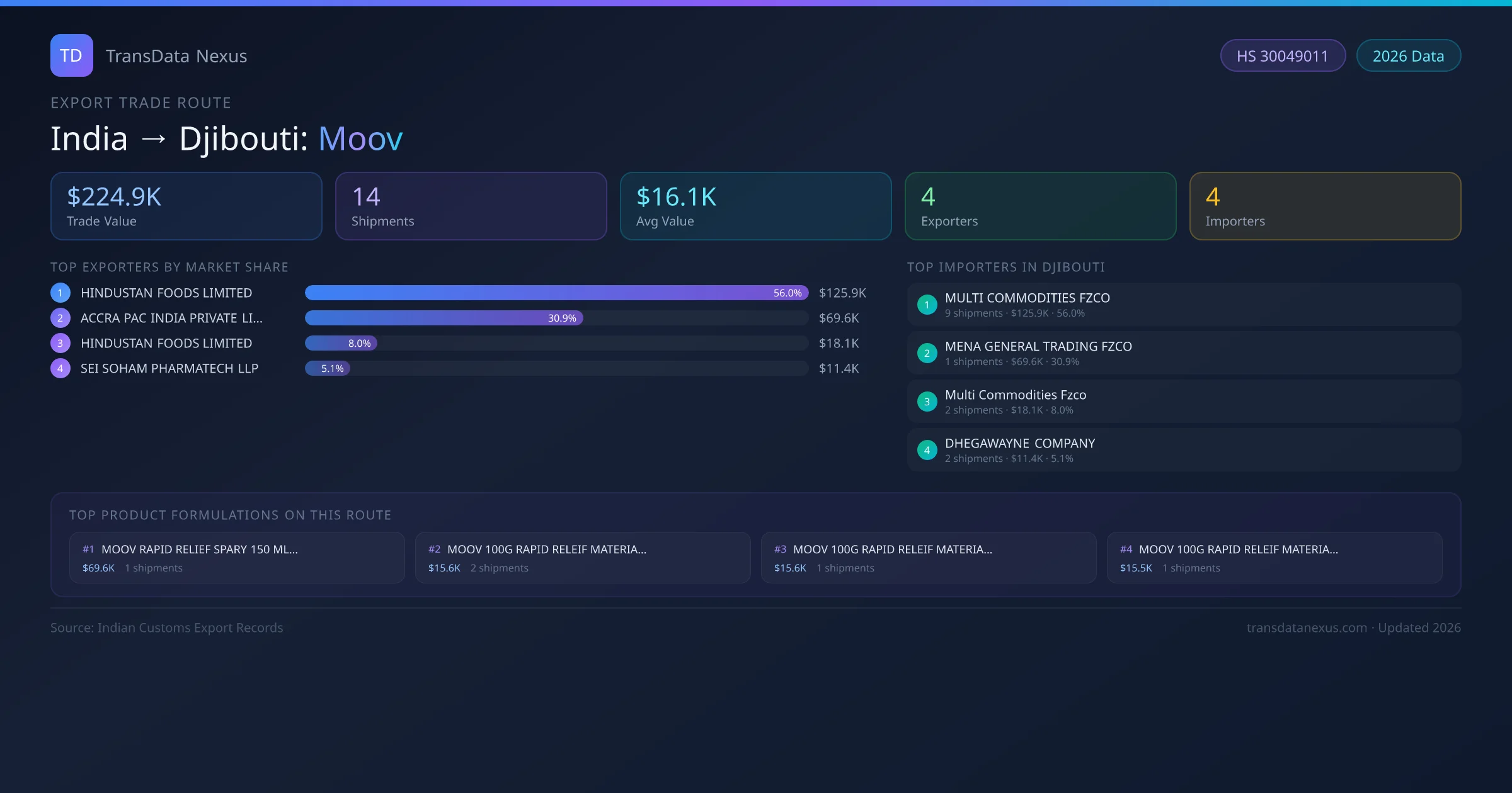India has recorded 14 verified shipments of Moov exported to Djibouti, representing a combined trade value of $224.9K USD. This corridor is served by 4 active Indian exporters, with an average shipment value of $16.1K USD. The leading Indian exporter is HINDUSTAN FOODS LIMITED, which accounts for 56% of total export value with 9 shipments worth $125.9K USD. On the buying side, MULTI COMMODITIES FZCO is the largest importer in Djibouti with $125.9K USD in purchases. The top 3 suppliers — HINDUSTAN FOODS LIMITED, ACCRA PAC INDIA PRIVATE LIMITED, HINDUSTAN FOODS LIMITED — together control 95% of total trade value on this route. All data sourced from Indian Customs (DGFT) shipping bill records. Values reported in FOB USD.