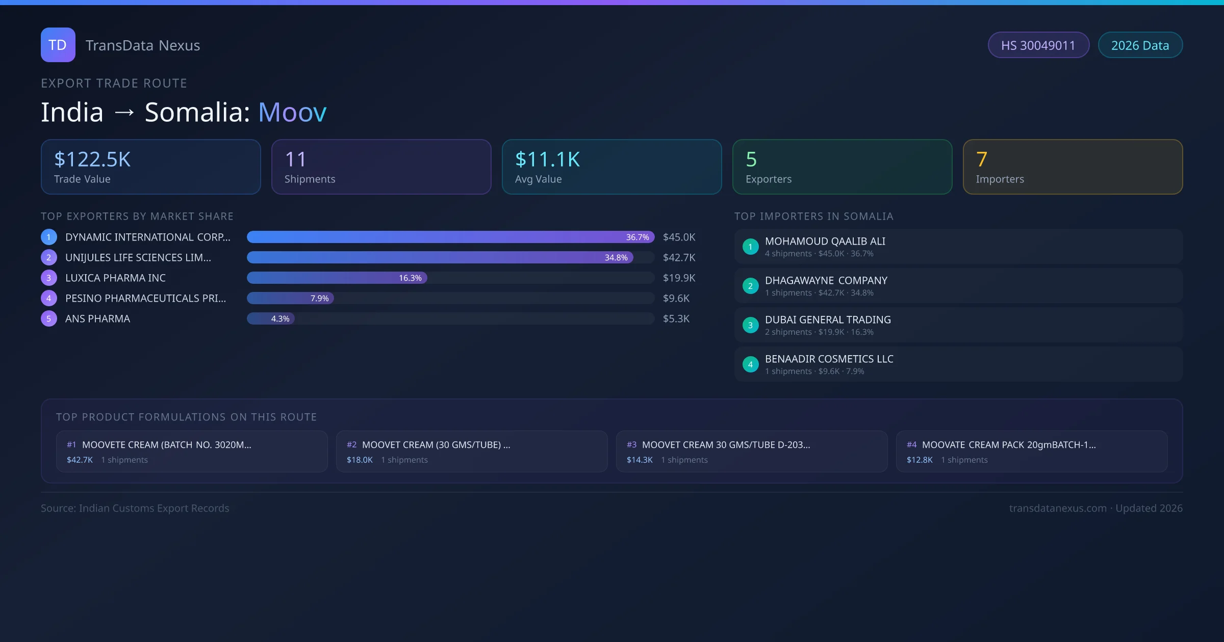 India has recorded 11 verified shipments of Moov exported to Somalia, representing a combined trade value of $122.5K USD. This corridor is served by 5 active Indian exporters, with an average shipment value of $11.1K USD. The leading Indian exporter is DYNAMIC INTERNATIONAL CORPORATION, which accounts for 37% of total export value with 4 shipments worth $45.0K USD. On the buying side, MOHAMOUD QAALIB ALI is the largest importer in Somalia with $45.0K USD in purchases. The top 3 suppliers — DYNAMIC INTERNATIONAL CORPORATION, UNIJULES LIFE SCIENCES LIMITED, LUXICA PHARMA INC — together control 88% of total trade value on this route. All data sourced from Indian Customs (DGFT) shipping bill records. Values reported in FOB USD.