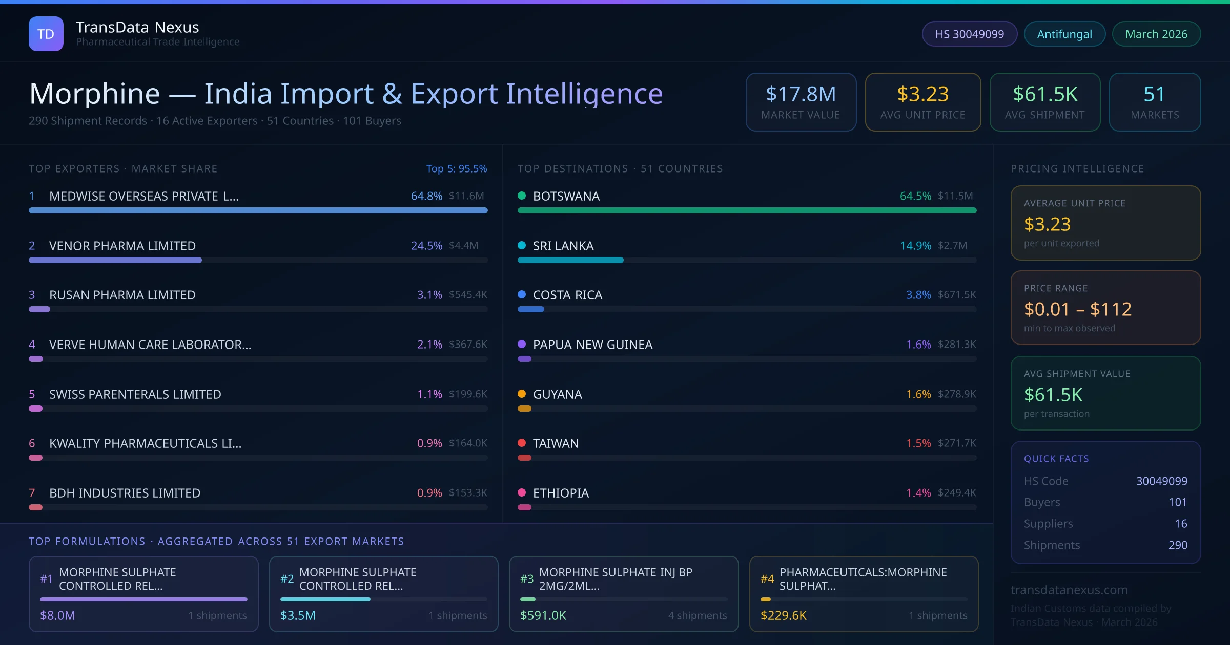 Between 2022 and 2026, India exported $17.8M worth of morphine across 290 verified shipments to 51 countries — covering 26% of world markets in the Analgesics & Antipyretics segment. The largest destination is BOTSWANA (64.5%). MEDWISE OVERSEAS PRIVATE LIMITED leads with a 64.8% share. All figures are drawn from Indian Customs (DGFT) shipping bill records spanning four years of trade activity.